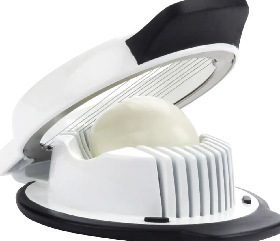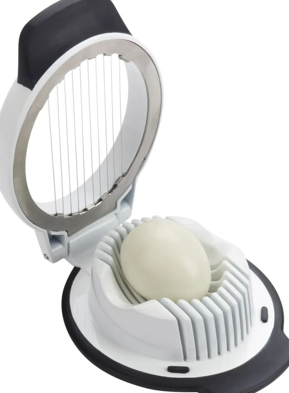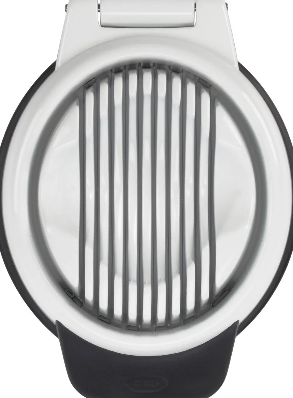 Deler hårdkogte æg i fine skiver. OXOs æggedeler kan holde ægget i to retninger, så det kan deles enten på tværs eller på langs. En bund af non-slip gummi gør at den står godt fast på underlaget når du bruger den. Kan vaskes i opvaskemaskinens øverste kurv.