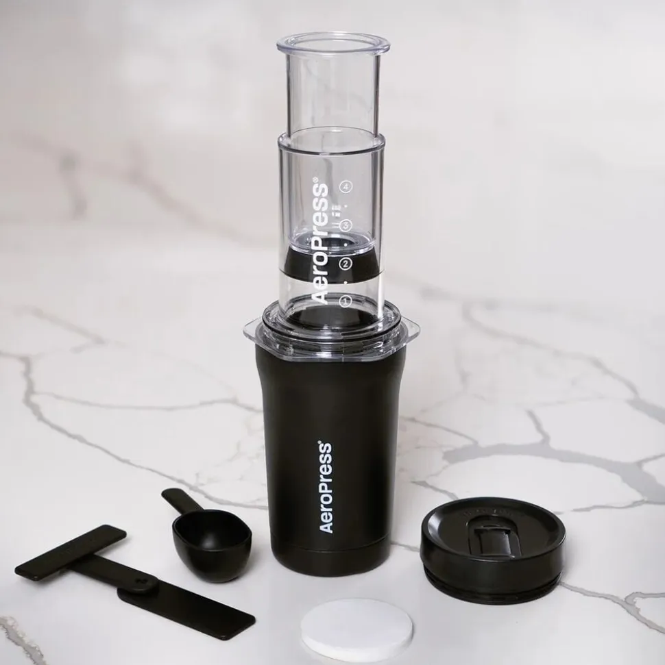 AeroPress Go Plus er et komplet rejse-kaffesystem – du kan pakke det ud, brygge silkebløde kaffe, og pakke pressen ned igen i den medfølgende termokop, der også fungerer som opbevaringsbeholder.