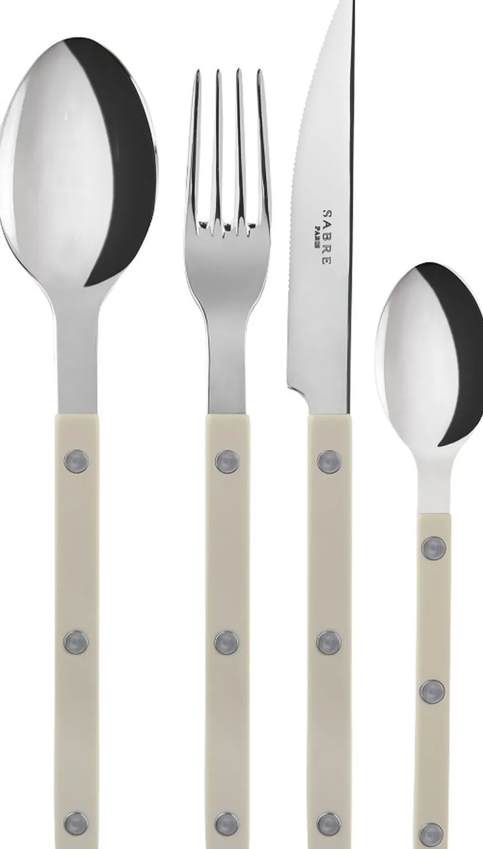 Bestiksættet med fire dele fra Bistrot-serien fra Sabre Paris er inspireret af Paris mange restauranter, terrasser og caféer – steder, hvor mennesker mødes med deres nærmeste for at nyde god mad og godt selskab. Bestikket er designet til at indfange atmosfæren på en troværdig måde, men med et moderne touch. Designet er enkelt med synlige nitter, som står i flot kontrast til materialerne og de forskellige farvevalg. Sabre 4-dele sættene består af en spiseske, en middagsgaffel, en middagskniv og en teske. Dette 4-dele sæt tilbyder den perfekte kombination til dine daglige måltider.
