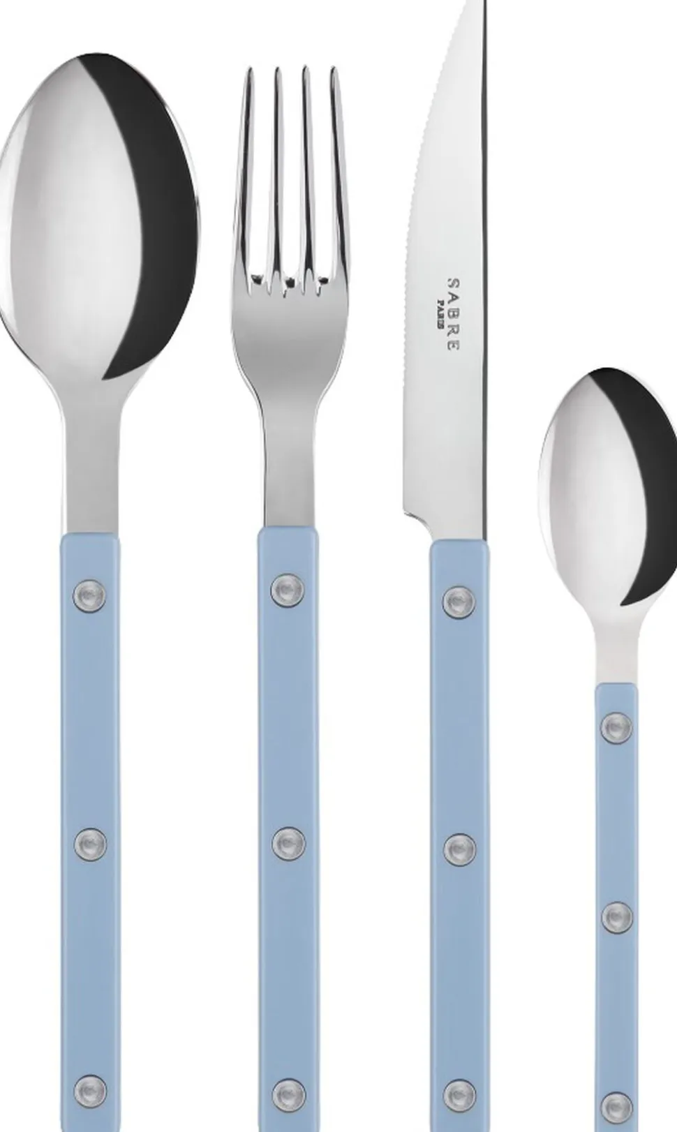 Bestiksættet med fire dele fra Bistrot-serien fra Sabre Paris er inspireret af Paris mange restauranter, terrasser og caféer – steder, hvor mennesker mødes med deres nærmeste for at nyde god mad og godt selskab. Bestikket er designet til at indfange atmosfæren på en troværdig måde, men med et moderne touch. Designet er enkelt med synlige nitter, som står i flot kontrast til materialerne og de forskellige farvevalg. Sabre 4-dele sættene består af en spiseske, en middagsgaffel, en middagskniv og en teske. Dette 4-dele sæt tilbyder den perfekte kombination til dine daglige måltider.
