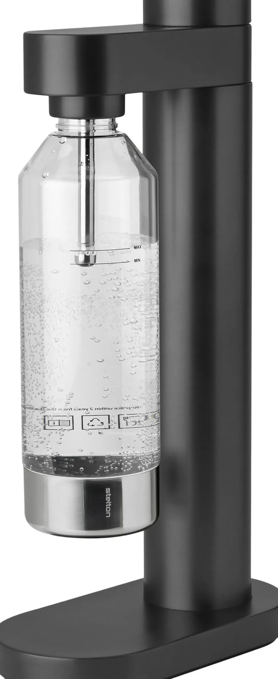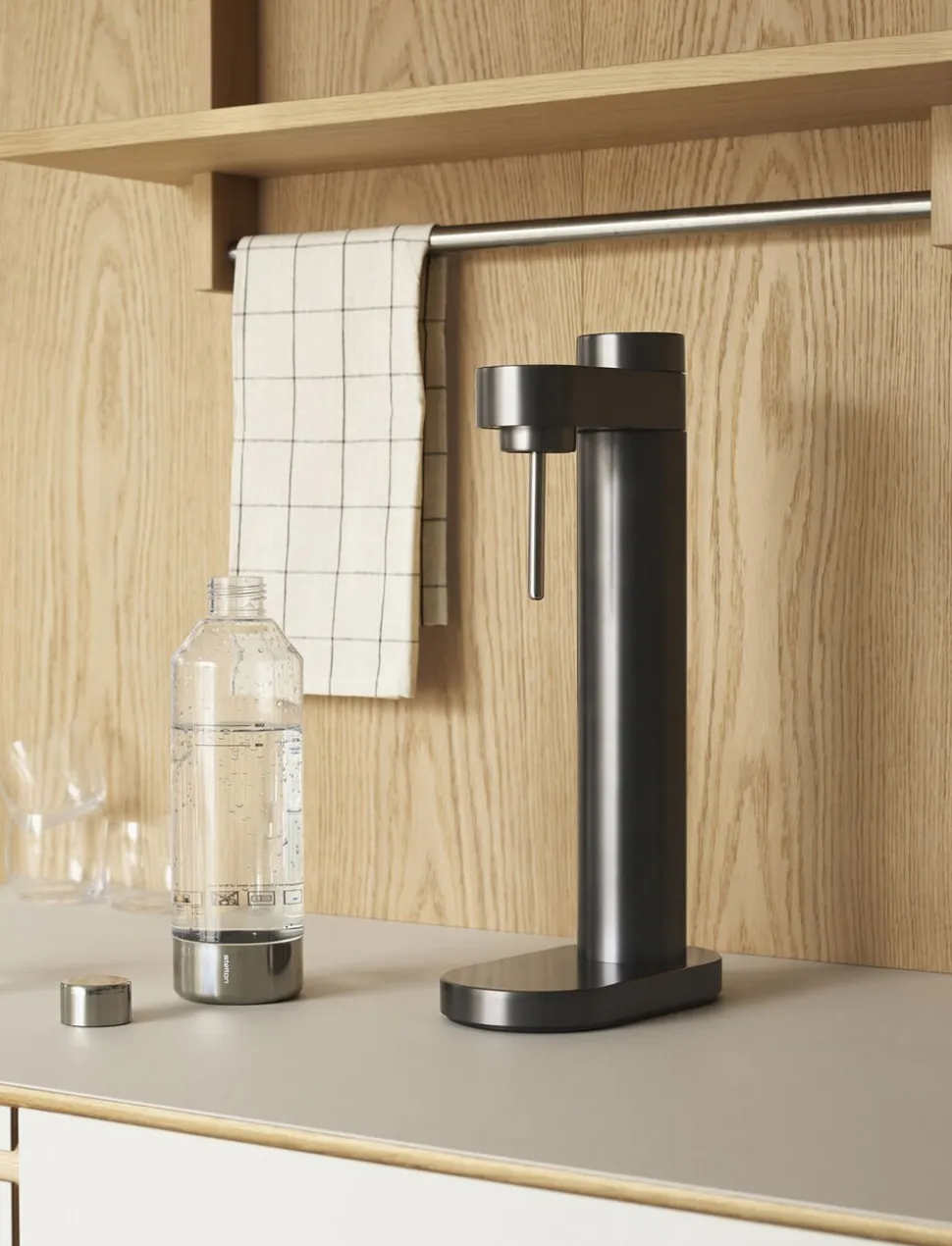 Med Brus kulsyremaskine sparer du miljøet for store mængder af unødigt plast ved at lave din egen danskvand eller sodavand i genanvendelige flasker. Designet af sodavandsmaskinen er så elegant, at du kan glæde dig over at have den stående fremme på køkkenbordet. Designeren bag, Søren Refsgaard er kendt for sit rene funktionelle design, hvor alt overflødigt er skåret væk. Det er Brus et særdeles godt eksempel på. Designet trækker på de cylindriske former, der er klassisk for Steltons design. Den cylindriske form ses først og fremmest i den ultraslanke beholder til kulsyrepatronen og går igen i kulsyreknappen, der intuitivt drejes med uret for at tilpasse mængden af kulsyre og drejes kontra, når flasken skal løsnes fra maskinen. Brus kulsyremaskine leveres med et styk Brus flaske.