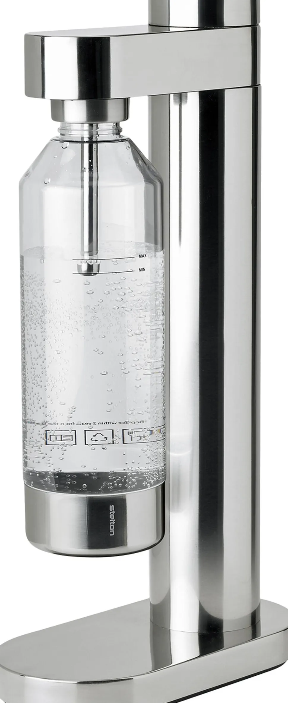 Med Brus kulsyremaskine sparer du miljøet for store mængder af unødigt plast ved at lave din egen danskvand eller sodavand i genanvendelige flasker. Designet af sodavandsmaskinen er så elegant, at du kan glæde dig over at have den stående fremme på køkkenbordet. Designeren bag, Søren Refsgaard er kendt for sit rene funktionelle design, hvor alt overflødigt er skåret væk. Det er Brus et særdeles godt eksempel på. Designet trækker på de cylindriske former, der er klassisk for Steltons design. Den cylindriske form ses først og fremmest i den ultraslanke beholder til kulsyrepatronen og går igen i kulsyreknappen, der intuitivt drejes med uret for at tilpasse mængden af kulsyre og drejes kontra, når flasken skal løsnes fra maskinen. Brus kulsyremaskine leveres med et styk Brus flaske.