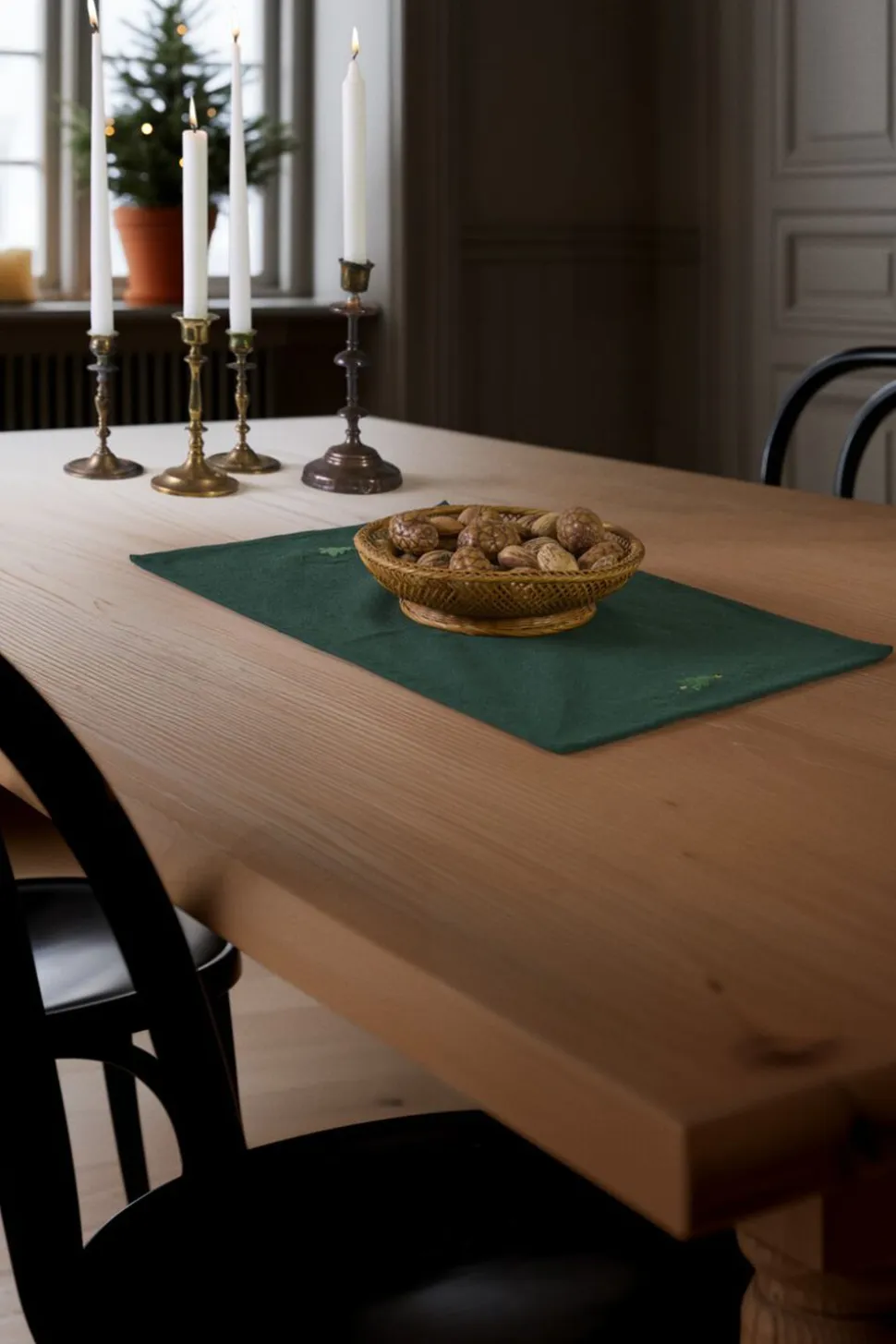 Mærk stemningen med JUNA Christmas Fable magiske juletekstiler til alle rum. Juleeventyr, fantasi og humoristiske dekorationer med masser af cosy kant. Med JUNA Christmas Fable får du en serie af moderne tekstiler med broderede motiver, der både æstetisk og legende forankrer og fornyer julens helt særlige stemning gennem et magisk juleunivers fuld af traditioner, hygge og personlighed. Tænk på en komplet og fuldstændig gennemført julekollektion af certificerede tekstiler til både dit køkken og resten af hjemmet. De dekorative julesokker på trappen fyldt op med dagens kalendergaver. Duftene fra køkkenet, der blander sig med hjertevarme forventninger og kærlige minder om en hyggelig aften i stuen. Den ikoniske juleborddækning, der løfter stemningen og får både børn og voksne til at glædes sammen. Og forestil dig så det hele tilsat nærmest karikerede klassiske broderier, der fortæller endnu flere historier end de tråde, de er syet med. Tryllebunden misteltensmagi, skitseagtige juletræer, nuttede rensdyr, ikoniske julehjerter og fluffy julestjerner. Alle skabt med masser af glimt i øjet i en sød og bevidst naivistisk stil, der ikke kan undgå at sende dit julehumør helt op til den skønneste stjernehimmel. JUNA Christmas Fable er skabt til at samle os omkring bordet, i køkkenet og også trække julestemningen med helt ind på puden, inden vi rammer drømmeland. Fuld af små broderede detaljer. Spækket med de helt store julefølelser. Denne fortryllende JUNA Christmas Fable-dækkeserviet i en dyb julegrøn farve er dekoreret med to broderede motiver af seriens juletræ omgivet af de yndigste små julestjerner, der titter frem på hver side af dækkeservietten, så du ikke skjuler de søde dekorationer, når du dækker op med tallerkener og bestik. Dækkeservietten måler 49×32 cm og kommer i et skønt mix af GRS-certificeret genanvendt bomuld, GRS-certificeret genanvendt polyester og en lille smule viskose, der gør stoffet ekstra lækkert. JUNA Christmas Fable-serien giver dig et bredt udvalg af certificerede juletekstiler til hele hjemmet, hvor du mærker julestemningen i hver eneste tråd, og som du kan glæde dig til at finde frem jul efter jul. En kærlighedserklæring til godt håndværk og dekorativt dansk design vævet sammen af store eventyr og små broderede detaljer skabt til at holde længe og blive elsket endnu længere. (GRS Certified by Control Union, 1026087)