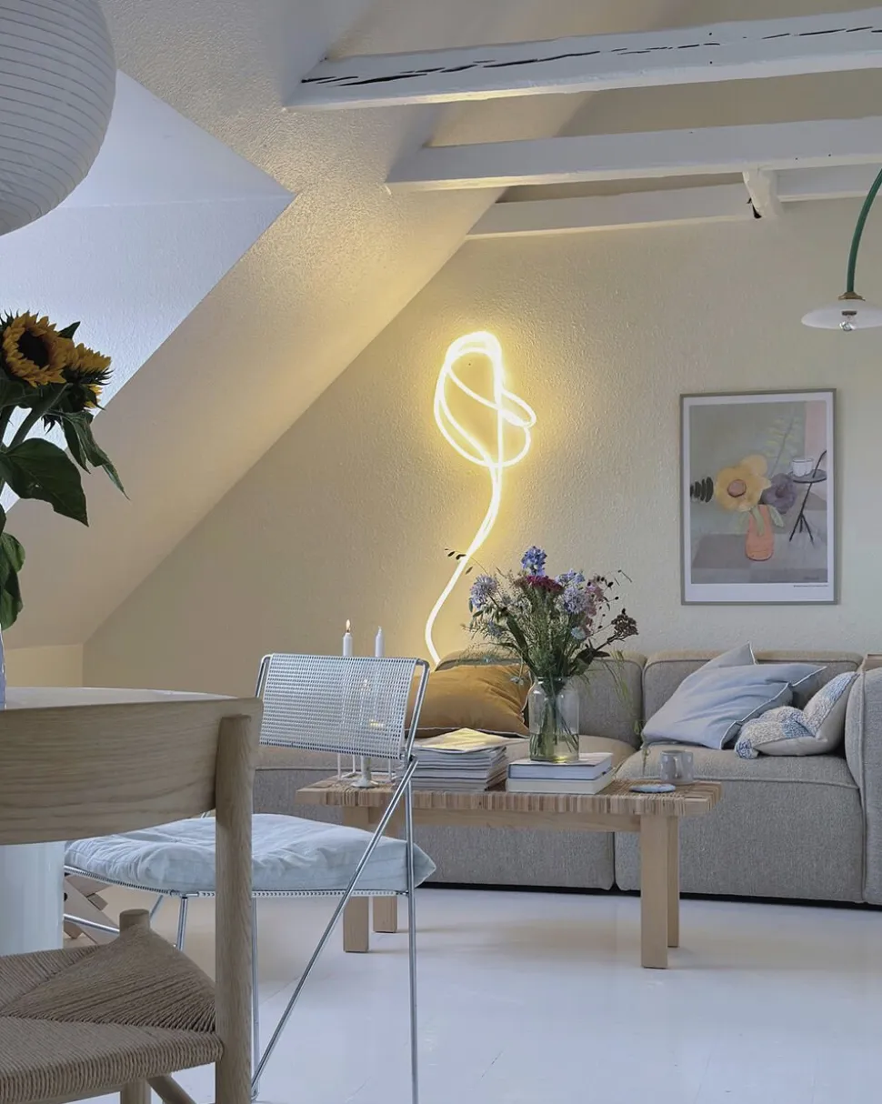 Designet er rent og minimalistisk, men dens bevægelighed gør den organisk og kunstnerisk, og lampen er derfor den perfekte fusion mellem det stilrene, funktionelle og det æstetiske. Den inviterer til kunstnerisk udfoldelse og kreativitet, og derfor er lampen den bedste form for belysning til en eksperimenterende livsstil. Form lampen som du ønsker og skab et legende mønster eller lysskulptur, og se, hvordan den transformerer til et kunstværk. Den varme hvidlige farve har et blødt, men effektivt skær, som lyser hjemmet op på en fascinerende måde. Med FLEX-lampen kan du derfor bringe lys, varme, kreativitet og bevægelse ind i hjemmet.