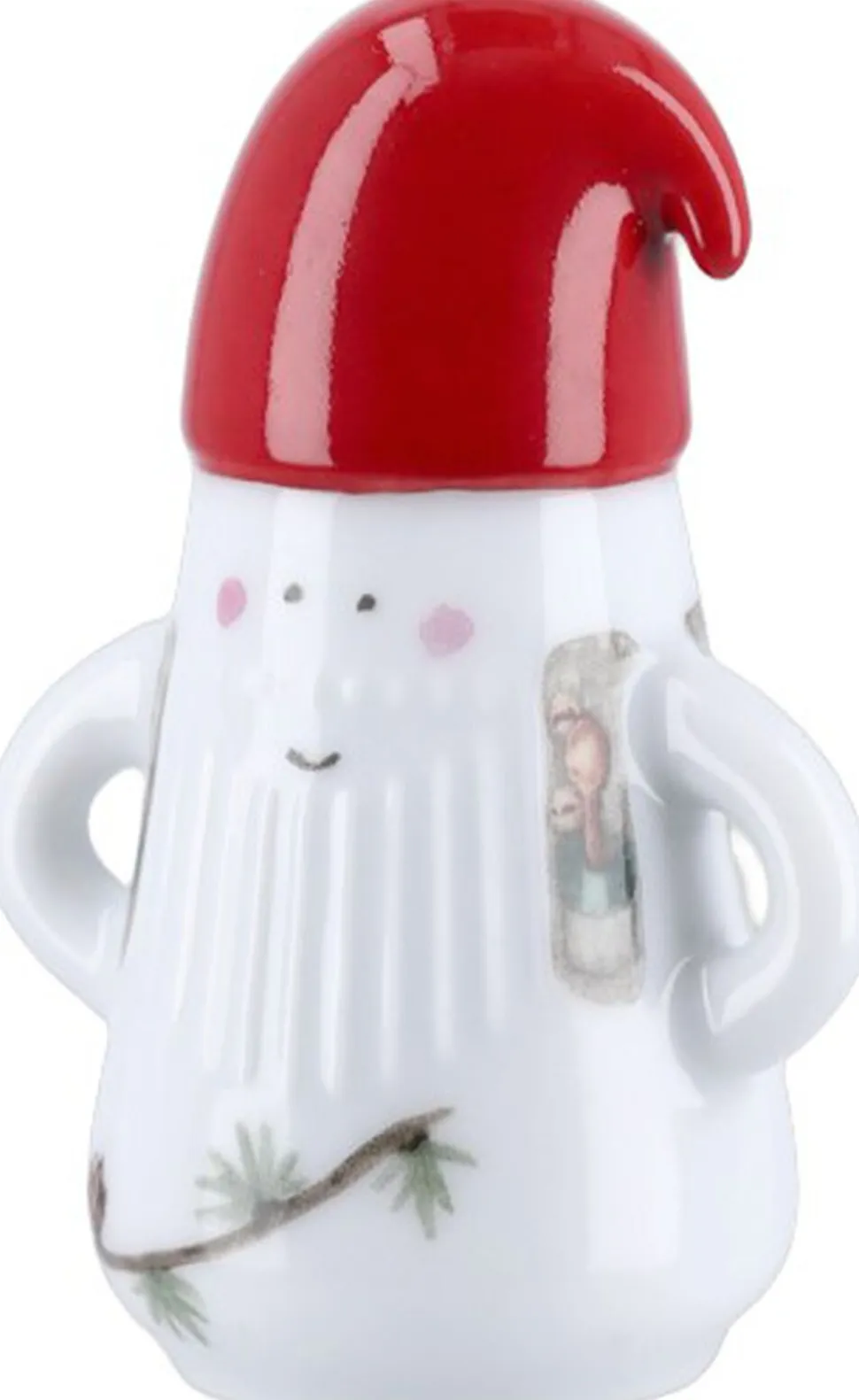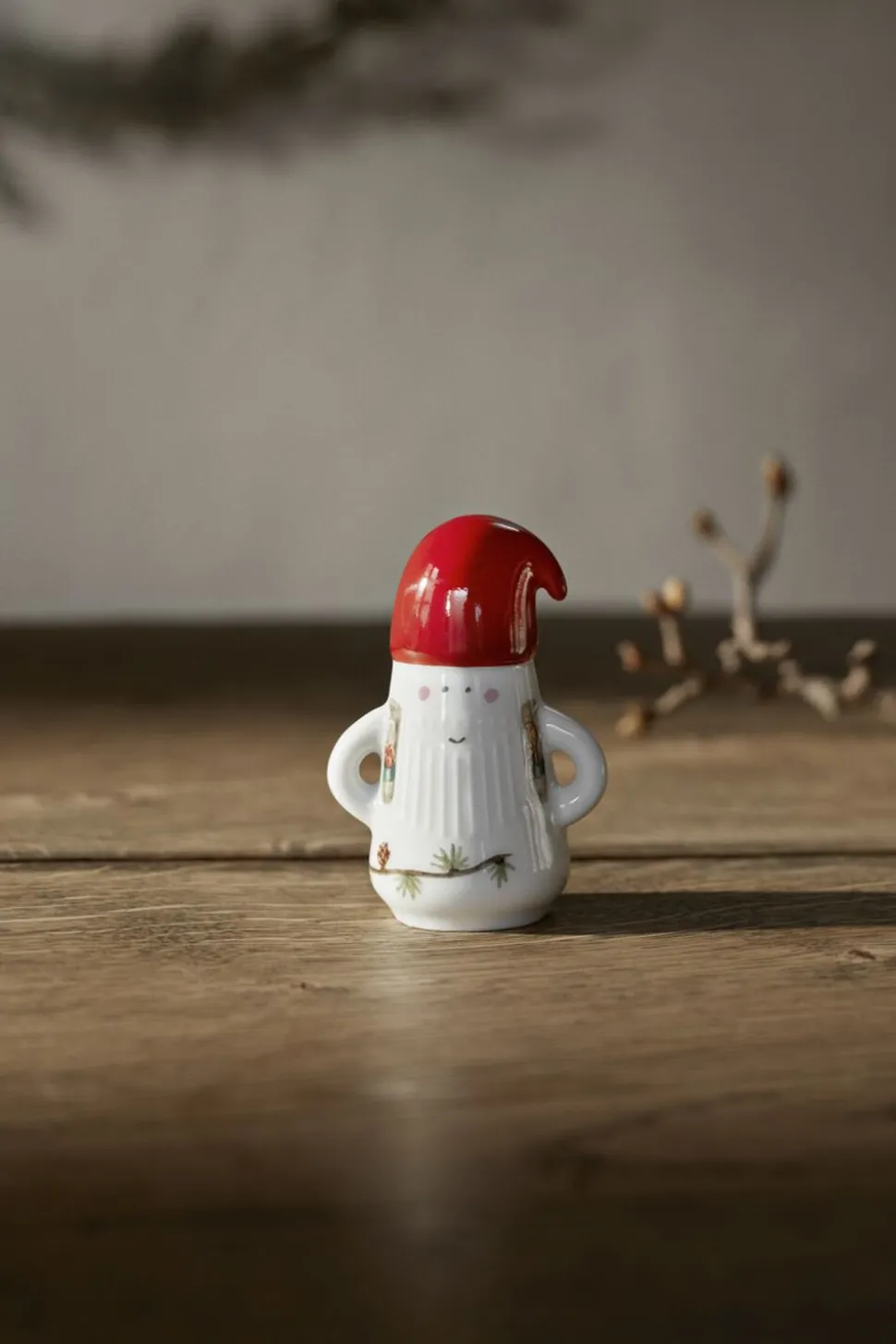 Juletraditioner og håndværkstraditioner i skøn forening. Med den lille nissefamilie med gaver fra Kählers juleserie Hammershøi Christmas bringer du julestemningen ind i boligen med glade smil og søde julemotiver i et skulpturelt og markant design, du kan mærke autenticitet og kreativt håndværk formet af tradition. Hammershøi Christmas-nissefar er udformet i bløde linjer med Hammershøi-seriens ikoniske riller, der kendetegner Hans-Christian Bauers stel og bordpynt. Nissefar-figuren måler 9 cm i højden og er foruden den ikoniske cedergren med lærkekogler dekoreret med en fin vest med fine guldknapper og lommer proppet med småkager og en træske, så han altid er klar til at spise risengrød. Nissefar elsker musik, så han har naturligvis sin trompet hængende på ryggen, så han altid er klar til at give et nummer. Ingen nisse uden nissehue. Og derfor har nissefar selvfølgelig også den sødeste håndmalede nissehue i ægte nisserød, der for ægte Hammershøi Christmas-fans nok vil virke ret bekendt med sit karakteristiske buk ud til siden. Den er nemlig ligesom alle de andre motiver i serien skabt og malet i akvarel af kunstner Rikke Jakobsen i den velkendte hyggelige og håndmalede stil og herefter overført til det snehvide porcelæn med en særlig teknik. Hammershøi Christmas-nisserne er sammen med figuren med gavestakken autentisk dansk design, der kan gøre spisebordet mere levende, fortælle nye historier i vindueskarmen og fremhæve dit hjems skønhed fra en simpel hylde i reolen. For ligesom julen er også Kähler formet af tradition. Med Kählers juleserie Hammershøi Christmas kan du dække op til alle decembers sammenkomster fra brunch og frokost til julemiddag og æbleskivehygge, og det er oplagt at invitere de søde nisser med til bords, hvor de vil skabe stemning og hygge. Og har du lagt mærke til en helt særlig både finurlig og funktionel designdetalje? Nissefiguren står stolt med armene i siden, så der dannes et lille hul omkring albuerne perfekt til at binde et flot bånd på og måske ovenikøbet vedhæfte dekorative bordkort til dine julegæster. Eller hvis du tør! Binde ham sammen med nissemor eller seriens anden nissefar så de kan stå som det sødeste lille nissepar. Enkelt, elegant og kreativt. Skabt af kreative og omhyggelige hænder. Fordi Kähler gør indtryk med sit tydelige aftryk.