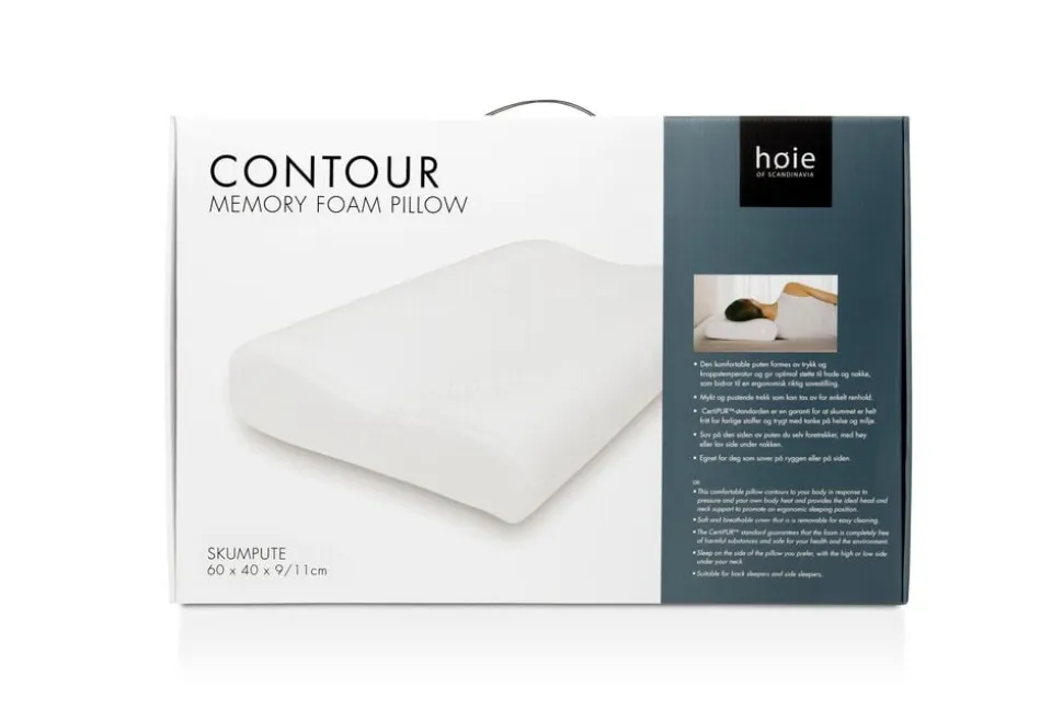 Høie Contour ergonomisk pude. En god nats søvn afhænger i stor grad af at du ligger godt og finder en optimal sovestilling. Høie Contour skumpude er lavet specielt for at tilpasse sig til din individuelle hoved- og nakkeprofil. Det temperaturfølsomme specielskum formes efter din krop af kropstemperaturen. Dette bidrager til ergonomisk rigtig støtte og trykbelastning. Contour skumpude har en buet form, som følger de ergonomiske konturer for hoved og nakke. Den ergonomiske udformning af puden giver dig muligheden for at vælge, om du vil have nakken på den lave eller høje del af puden, afhængig af hvordan du foretrækker at ligge, når du sover. Høie Contour egner sig godt til dig, som bruger en medium høj pude med god støtte, og kan lide at sove på ryggen eller på siden. Med et blødt og formsyet betræk regulerer puden temperatur og fugtighed godt, og giver dig en god søvnoplevelse. Puden finder tilbage til sin naturlige form mellem hver gang, du bruger den. Pudebetræk i 50×70 cm passer til puden pga. højden på puden.