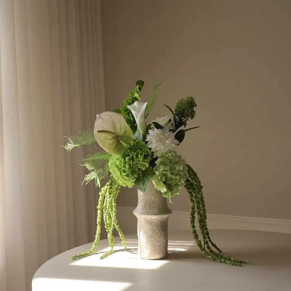 Denne lysegrønne Hydrangea Flower stem har en Single stor blomst med delikate, afrundede kronblade i bløde grønne nuancer. Kranserne har en glat tekstur, suppleret med brede åreblade. Stemmen når en højde på 49 cm. Den store keramiske jordvase på billedet måler 30,5 cm i højden og 10 cm i diameter.