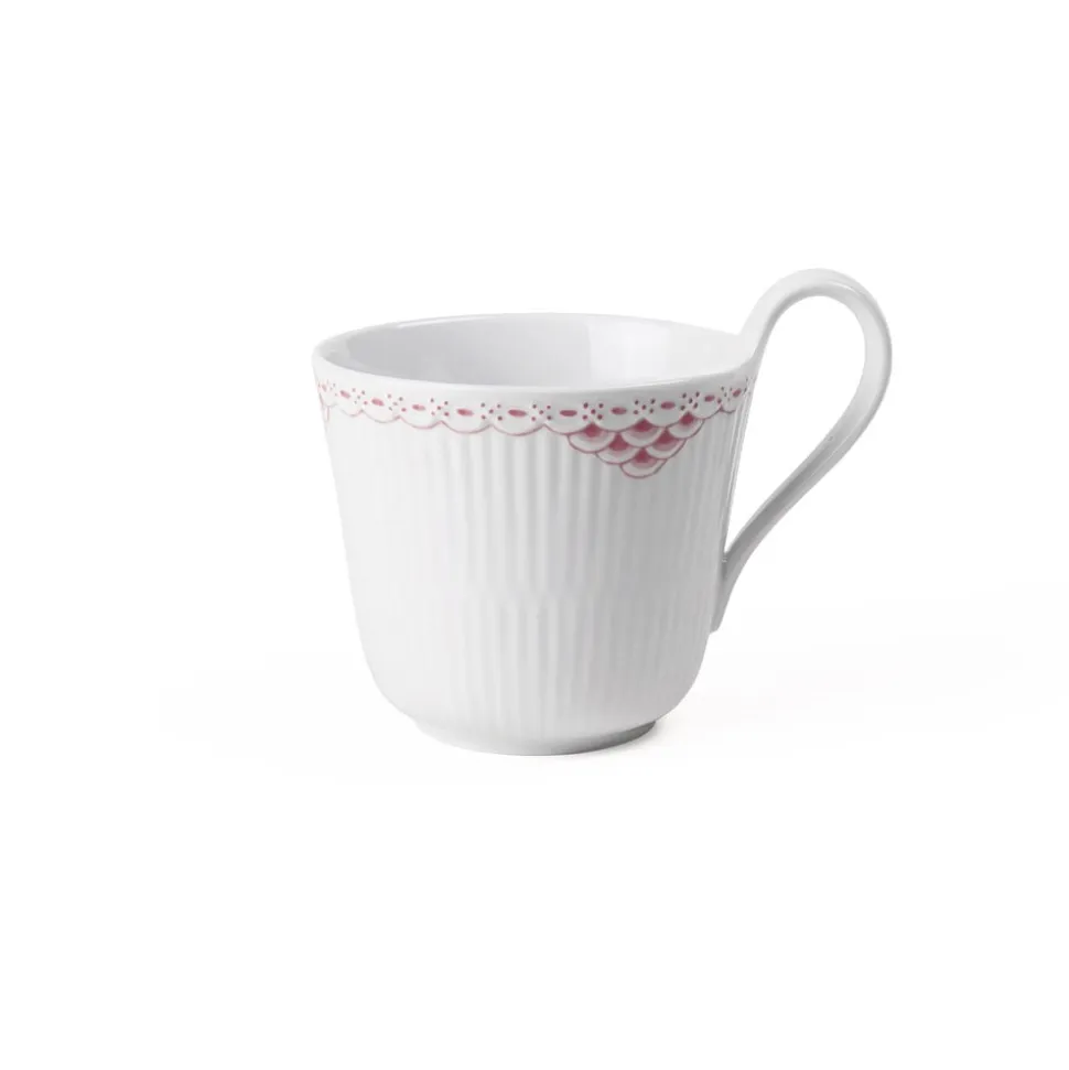 Højhankskoppen er en Royal Copenhagen klassiker. Denne Koral Riflet Blonde-version tilføjer et strejf af elegant minimalisme til koppens organiske form. Den halve blondekant er håndmalet i den bløde koralnuance, mens resten af porcelænets riflede overflade forbliver hvid. En moderne klassiker, designet til at modstå tidens tand.
