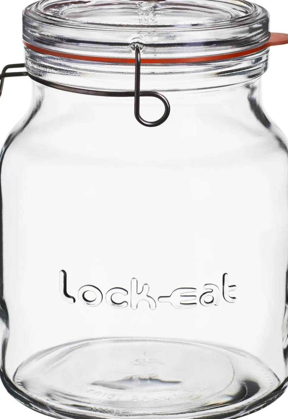 Lock-eat gør det nemt at konservere og servere frugt, grøntsager, hjemmelavet juice, syltetøj, marmelade og meget mere. Alle glas i Lock-eat kollektionen er lufttætte ved hjælp af et aftageligt patentlåg, en naturgummiring og klemmer af rustfrit stål, der alt sammen skal forhindre udviklingen af bakterier. Alle låg kan tages helt af, hvilket gør dem praktiske i brug og nemme at rengøre i opvaskemaskine. 2 års garanti.