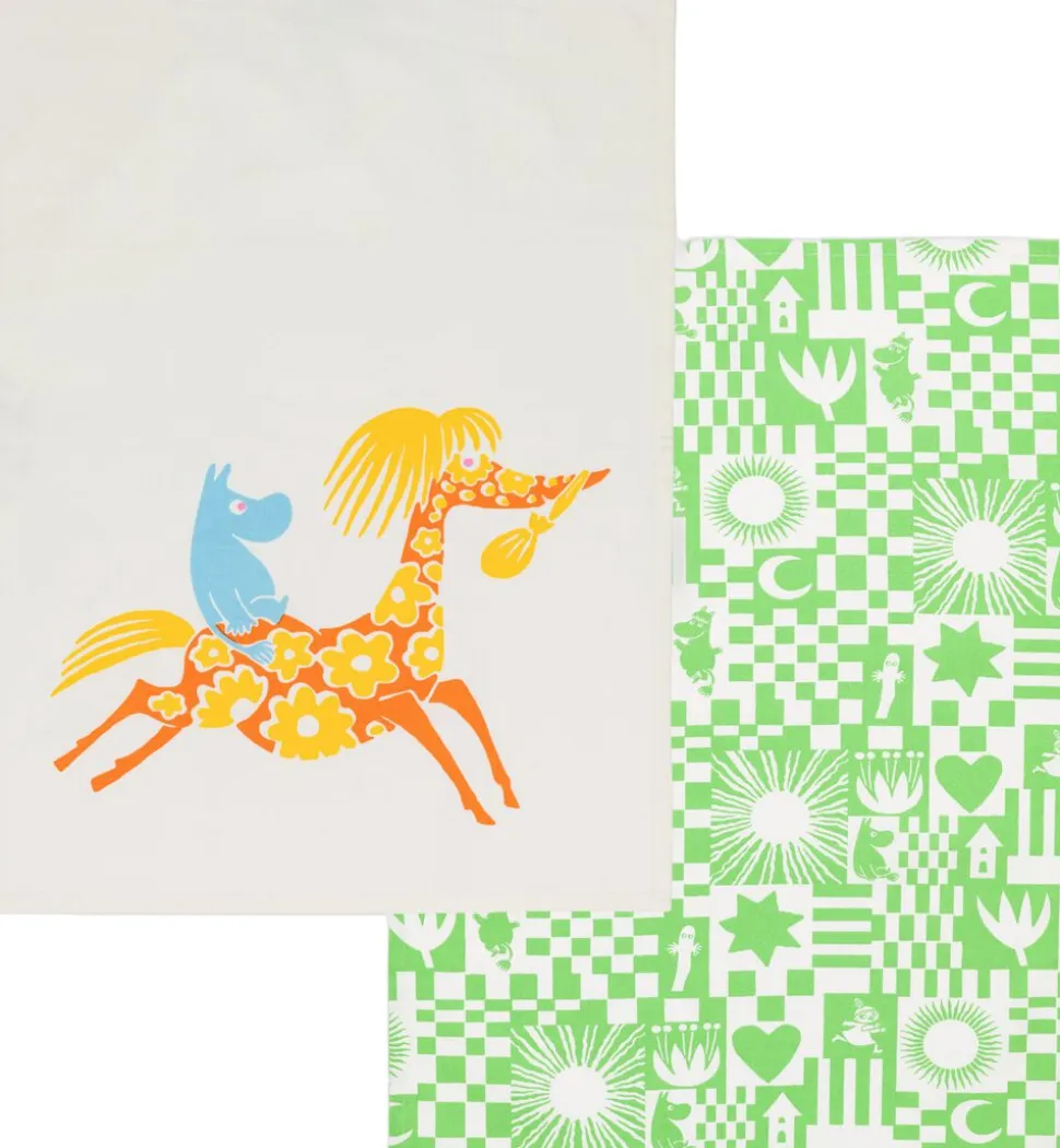 Få sommerstemning i køkkenet! Festkollektionens legende mønstre er baseret på tidlige mumimønstre fra 1950’erne med mange sjove elementer. Tilbered et lækkert måltid i stil med de livsglade mumier, og inviter dine nærmeste med til festen! Moomin Arabia-viskestykkesæt 50×70, grøn, Fest GOTS