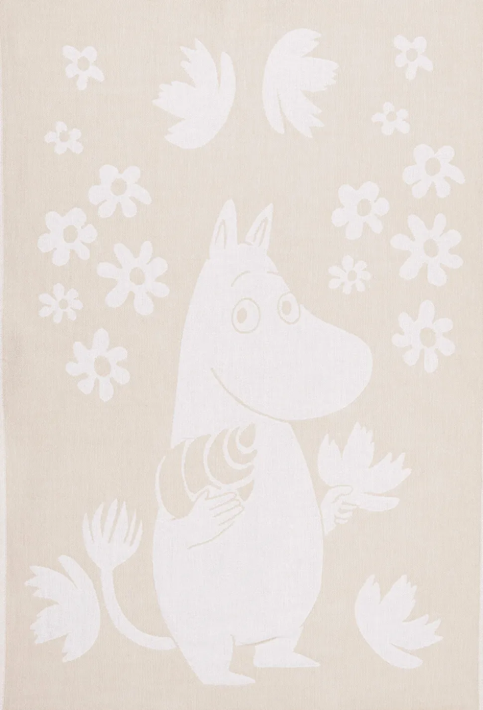 Foråret er kommet til Mumidalen! Mumitrolden nyder den blomstrende natur omkring sig. De florale elementer fremhæver Mumitroldenes stærke forbindelse til deres omgivelser, og den subtile beige tone passer til ethvert køkken. Moomin Arabia jacquard køkkenhåndklæde med Mumitrold, måler 45×65 cm.