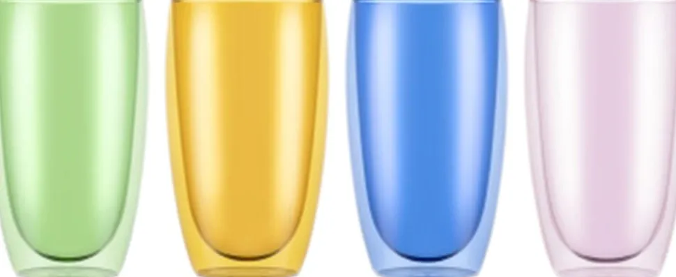 Glassene er produceret i fire afdæmpede eksklusive farver: pink, gul, grøn og blå. Konstruktion med innovativ dobbeltvæg, som holder varme drikke varme og kolde drikke kolde. En silikoneventil i bunden gør at ??glasset udligner lufttrykket mellem de to glaslag, når der tilsættes varme eller kolde væsker. Tåler opvaskemaskine, mikroovn og ovn (op til 180º).