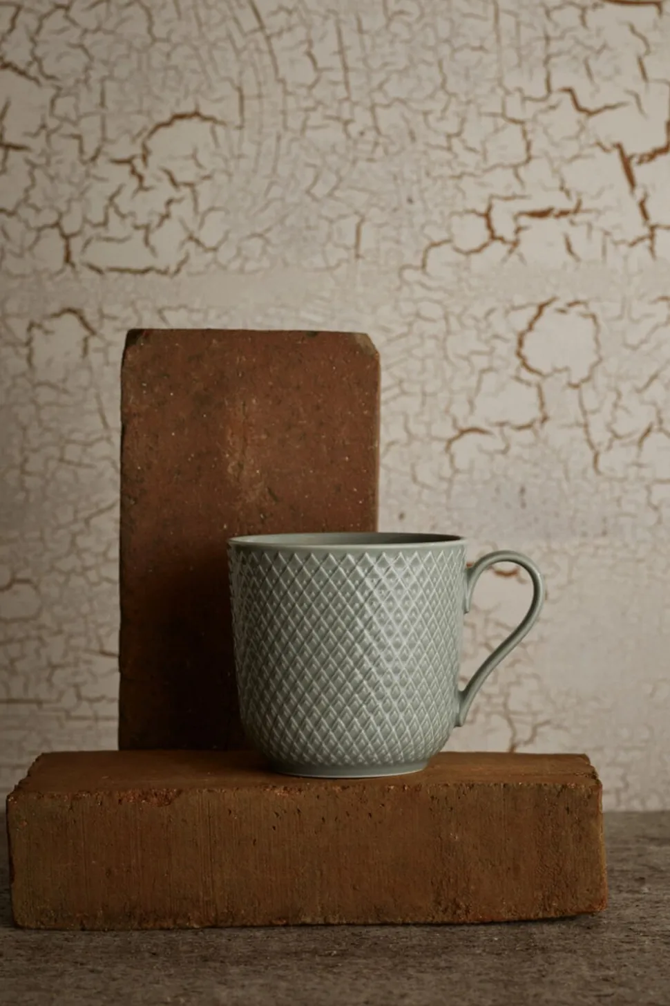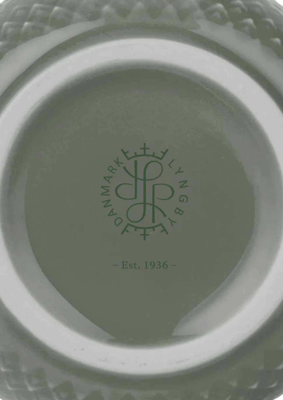 Et jordnært og nærværende udtryk på bordet og i hånden. Med en farvepalet i fire elegante jordfarver inviterer Rhombe Earth os til at sætte farten ned, være nærværende omkring det vi spiser og drikker, dem vi spiser med og at lægge mærke til skønheden i det stel, vi spiser og drikker af. Seriens krus på 39 cl er perfekte til en stor kop kaffe, te eller varm kakao og kommer ud over denne grågrønne moss også i de tre andre Rhombe Earth-farver marble, clay og slate afdæmpede jordfarver der bringer Rhombe-stellets ikoniske reliefmønster frem på en ny og anderledes måde og indbyder til, at vi går et lag dybere og giver opmærksomhed til din drik i kruset og maden på tallerkenen, til sanserne og til samtalen med de andre omkring bordet. Alle Rhombe Earth-seriens fire smukke nuancer er ligesom i Lyngby Porcelæns populære Rhombe Color-serie nøje udvalgt af designduoen Stilleben, der består af Ditte Reckweg og Jelena Schou Nordentoft. Brug alle de forskellige Rhombe Earth-dele sammen i din borddækning og lad de forskellige størrelser tallerkener titte frem under hinanden, så de lune farver får lov at tale sammen. Tallerkenerne, krusene og skålene i Rhombe Earth er selvfølgelig også både sammen og hver for sig oplagte som supplement til din Rhombe Color-samling eller i kombination med det klassiske hvide Rhombe-stel, hvor de grå og brune nuancer på de enkelte Rhombe Earth-dele sammen med Lyngby Porcelæns linjer til perfektion vil skabe et både moderne og afslappet udtryk og stå smukt op imod det hvide porcelæn.