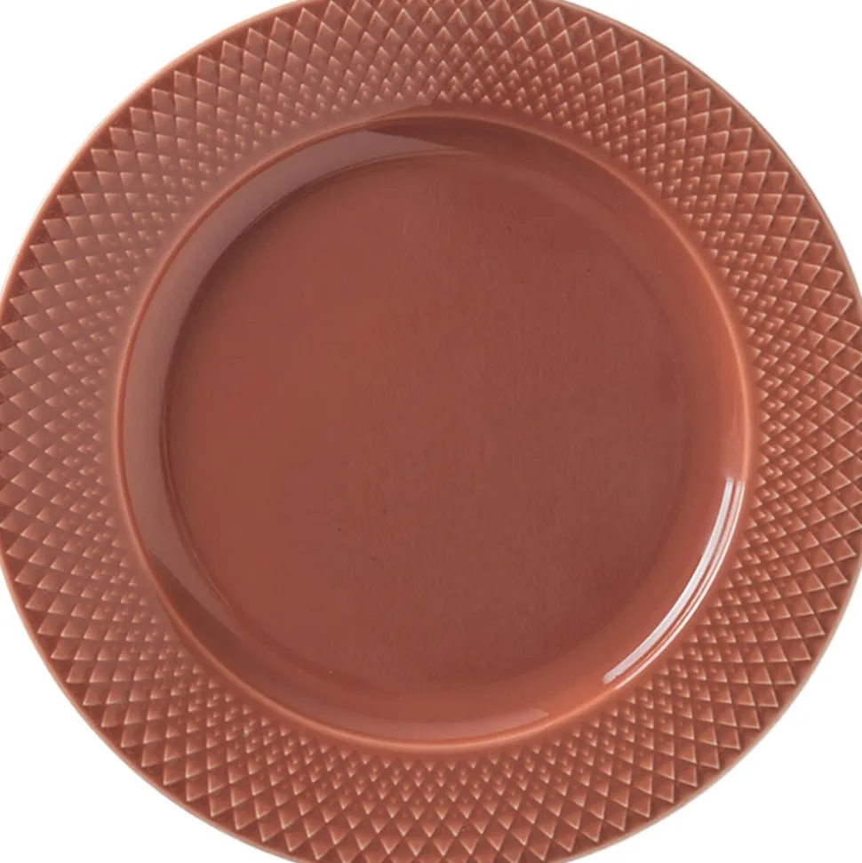 Der er endeløse kreative muligheder og farverne i Rhombe Color har en dyb farvemæthed, der vækker følelser og forstærkes af de varme toner. Farverne er udvalgt i et samarbejde med designduoen Stilleben. Rhombe-mønsteret stammer fra Lyngby Porcelæns arkiver og så første gang dagens lys tilbage i 1961. På den fine Rhombe-frokosttallerken i håndlavet porcelæn er mønstret ikke ligesom dengang overført på porcelænet som et mønster, men brugt som relief. Dette giver tallerkenen et simpelt og klassisk udtryk, der pryder borddækningen til både hverdag og fest. Middagstallerkenen er vist i terracotta. Rhombe middagstallerken har 2 års brudgaranti.