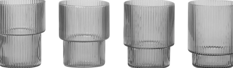 Sættet af fire enkeltvis mundblæste, røgfarvede glas med en skarpt riflet overflade giver et stærkt og raffineret udtryk. De fire forskellige geometriske udformninger skaber dynamik og energi mellem glassets form og funktion. Glassene er stabelbare og kan bruges med den tilhørende karaffel på ethvert stilfuldt morgen-, frokost- eller middagsbord. Glassene fås også i en klar variant.
