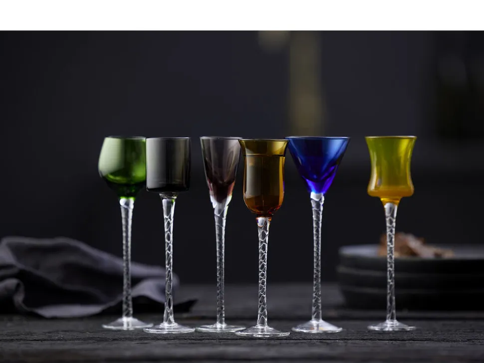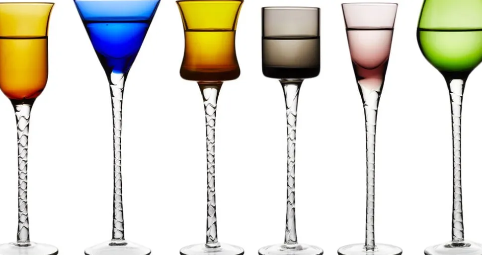 6 forskellige gennemfarvede, mundblæste snapseglas med snoet stilk bidrager til en god stemning ved bordet, og det er nemt at finde sit eget glas. Snapseglassene har forskellige udformninger i farverne lilla, blå, smoke, amber, grøn og gul og indeholder fra 2,5 op til 5 cl. H 18 cm.