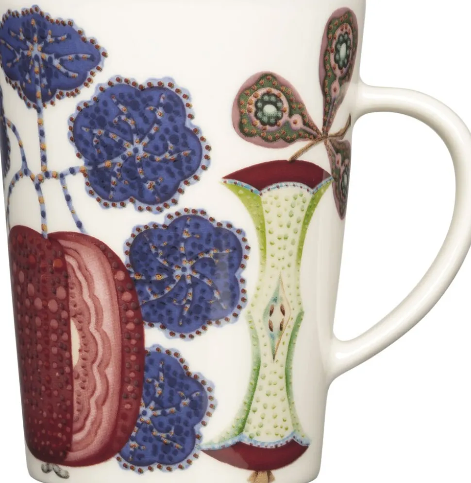 Taika Sato-samlingen henter inspiration fra stillebenskunst og kombinerer Klaus Haapaniemis livlige illustrationer af frugter og grøntsager med Heikki Orvolas funktionelle design. Taika Sato 30 cl kruset er perfekt til at nyde enhver varm drik, hvilket gør det til et smukt tilføjelse til daglige ritualer, og det fungerer også som en vidunderlig gave.
