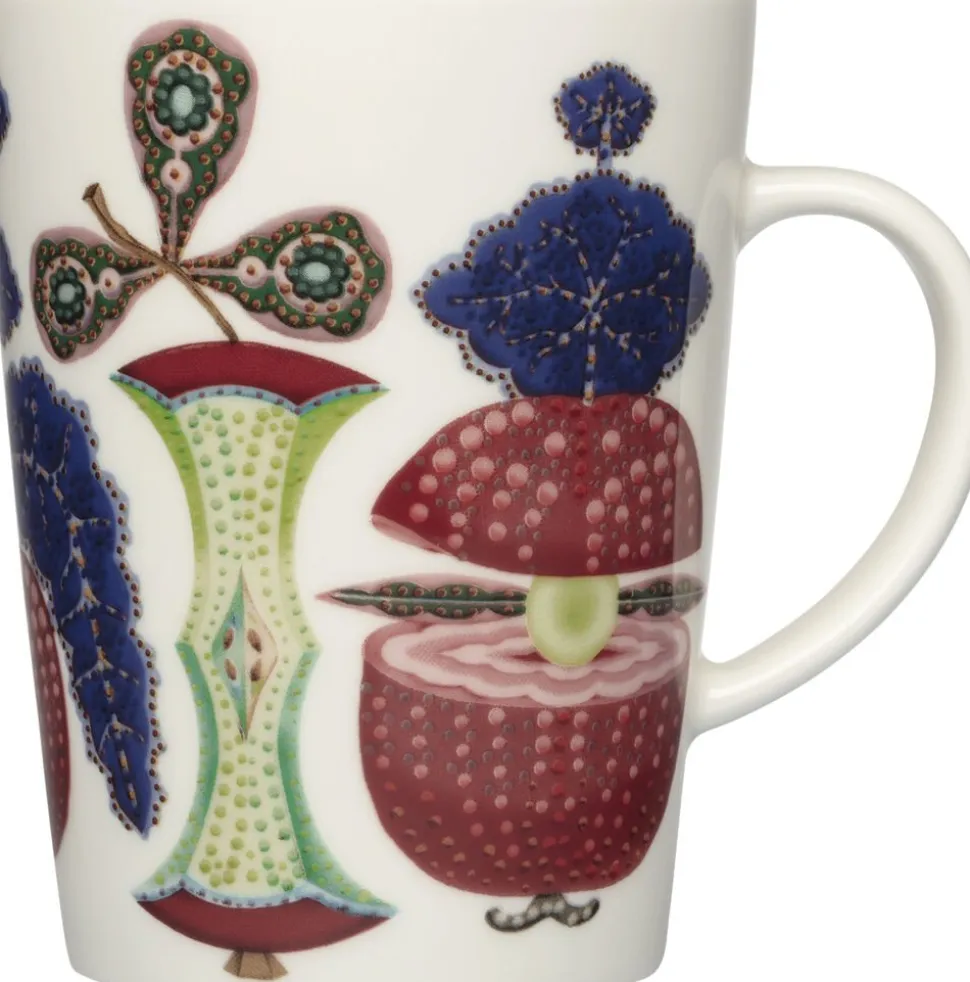 Taika Sato kombinerer Klaus Haapaniemis livlige illustrationer med Heikki Orvolas strømlinede design. Inspireret af stillebenskunst har Taika Sato 40 cl kruset levende skildringer af magiske frugter og grøntsager og tilføjer en snert af leg til dine kaffestunder. Med sin generøse størrelse er kruset ideelt til enhver varm drik, såsom kaffe eller te.