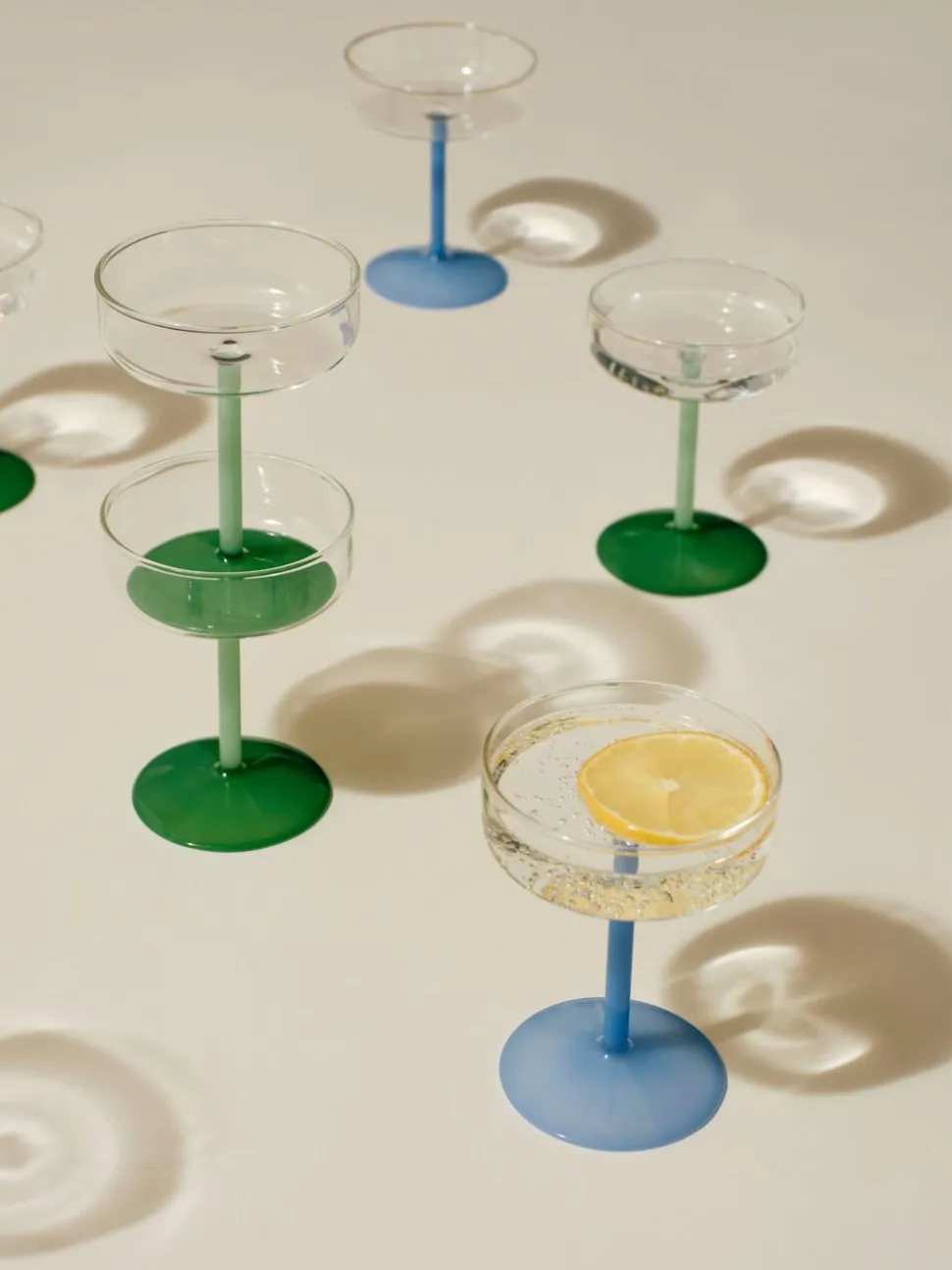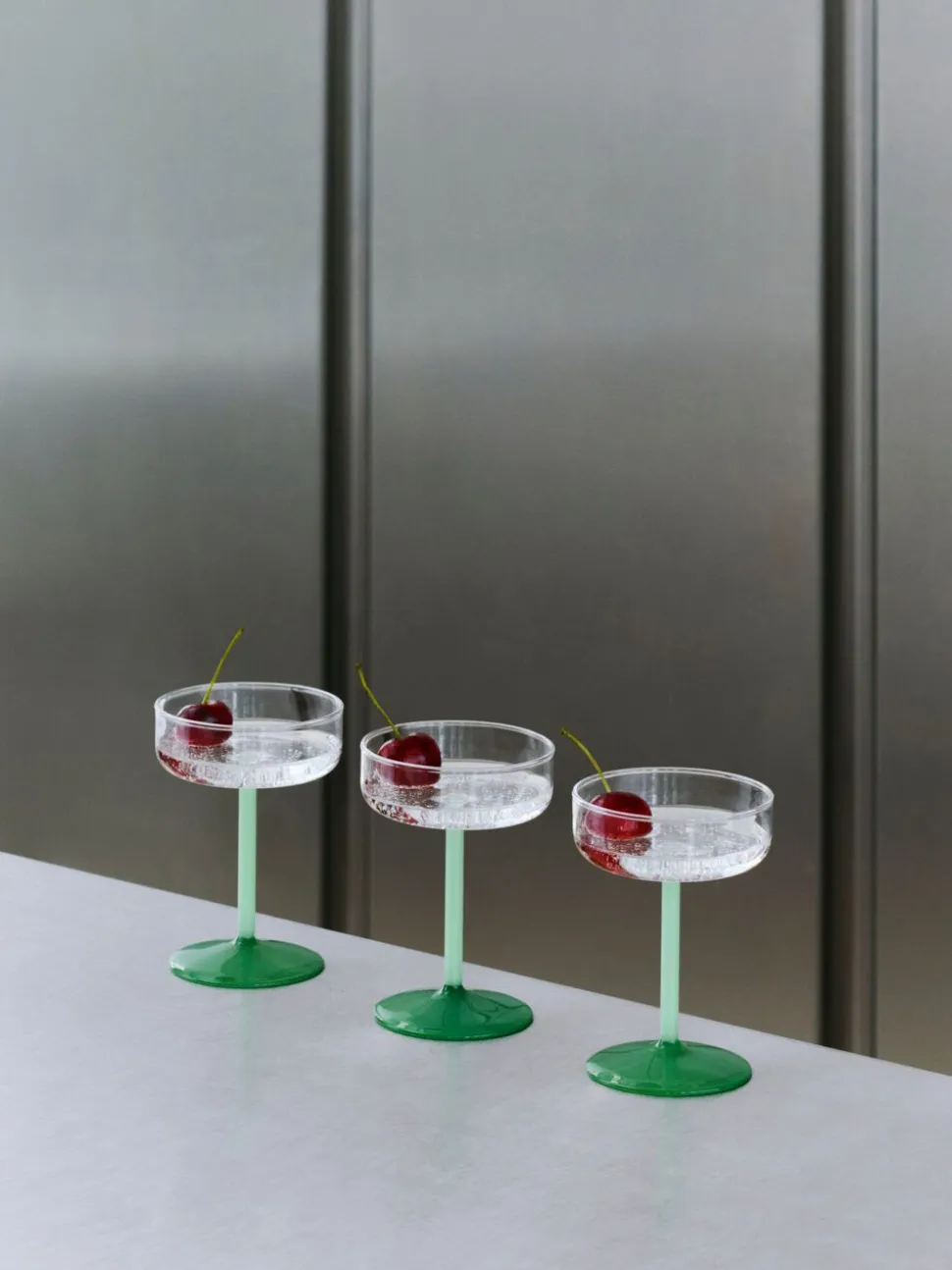 Tint Coupe Glass is a collection of elegant glasses made in tinted borosilicate glass. The classic coupe design features a long stem and shallow, broad bowl, making it suitable for serving champagne and cocktails, as well as ice cream, fruit or other desserts. The glasses come in sets of two.
