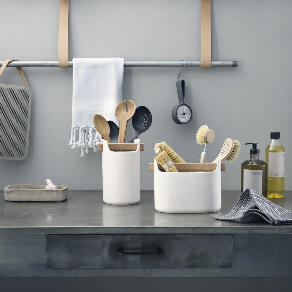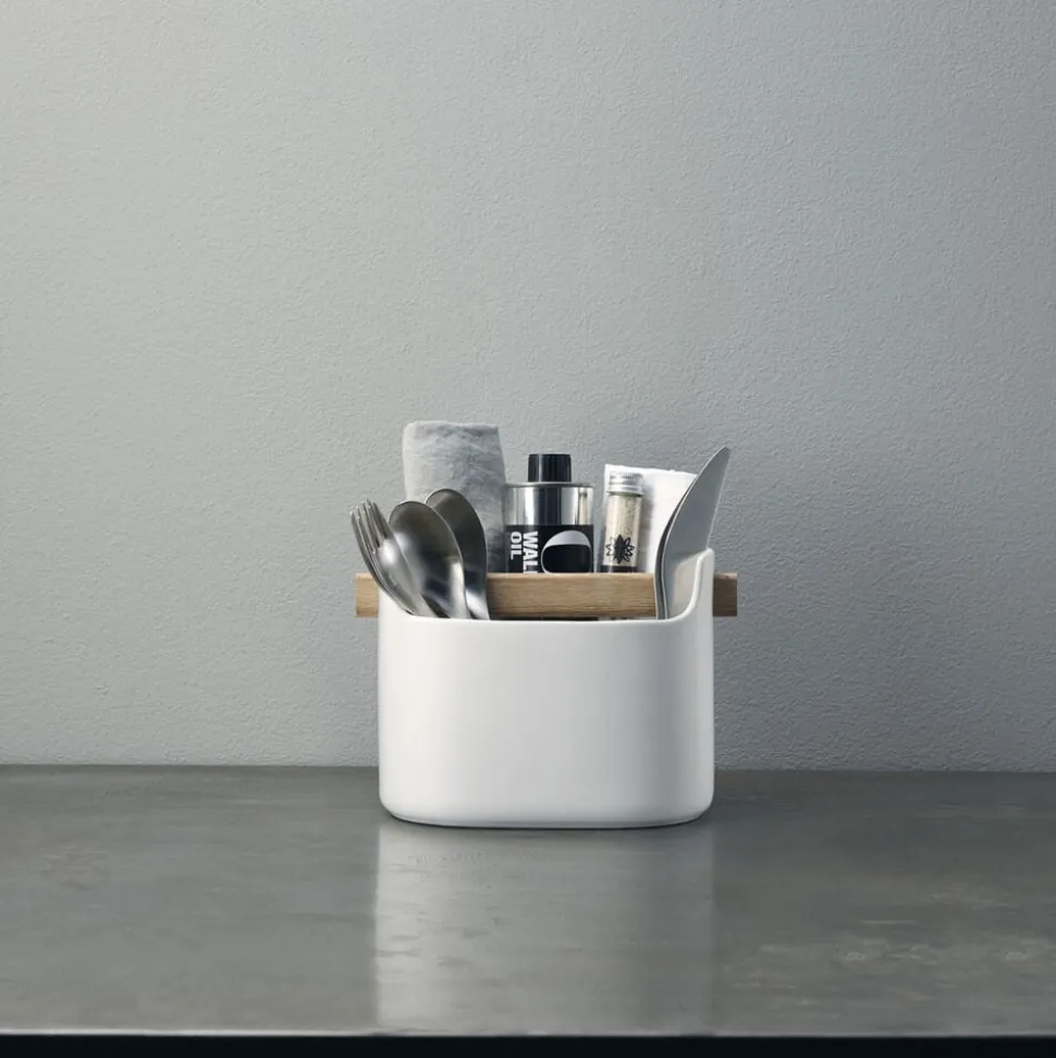 Med en Toolbox opbevaringskrukke kan man let sikre et ryddeligt køkken- eller skrivebord, og det er derfor slut med rod på bordet. Opbevaringskrukken har et træhåndtag, som kan fungere som rumdeler til adskillelse af f.eks. redskaber til opvask. Opbevaringskrukken er velegnet til opbevaring af eksempelvis køkkenredskaber, opvaskebørste, karklud, grydesvamp eller blyanter, saks og lineal.
