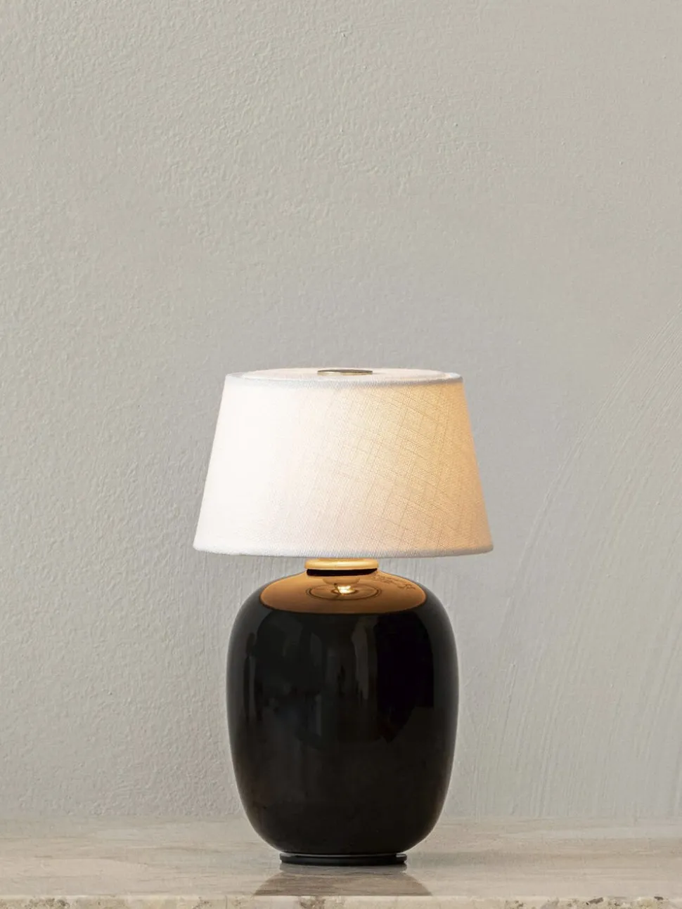 The Torso Portable Table Lamp by Krøyer-Sætter-Lassen is a miniature version of their popular full-size design of the same name, which takes its design cues from childhood homes filled with treasures shaped by the human hand. Petite and cosy, this diminutive design brings a sense of intimacy to tabletops, replacing the need for candles thanks to its soft, ambient light. It features a brass plated button on the linen canvas shade, enabling you to turn the light on and off at the tap of a finger. A concealed USB charger at the base ensures easy charging and is compatible with Audos Charging Board, which reanimates multiple devices in a single sitting. To preserve battery life, switch the lamp off when charging and do not leave plugged in while in use. [dimensions-start] H: 20 cm, Ø: 12 cm [dimensions-end] [materials-start] Ceramic, textile, steel, ABS [materials-end] [additional-resources-start] DOWNLOADS PRODUCT FACT SHEET 2D/3D FILES ASSEMBLY INSTRUCTIONS [additional-resources-end] [vimeo-video-embed-start] https://vimeo. com/603855807 [vimeo-video-embed-end]