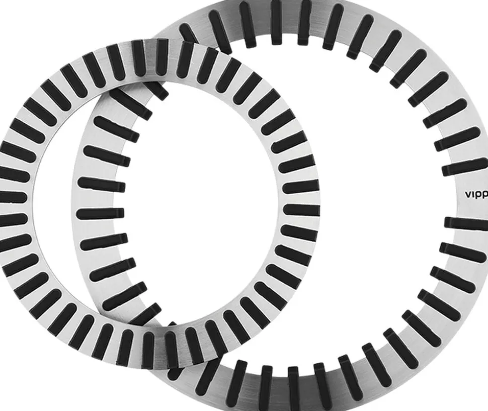 Dæk dit bord med et funktionelt bordskånersæt fra Vipp. Sættet består af en lille og en stor bordskåner, der passer ind i hinanden. Bordskånerne er udskåret med laser i 3-mm massivt rustfrit stål. Forhøjningerne på stålringene er fremstillet af silikonegummi, der tåler op til 275 grader og garanterer, at det varme køkkenudstyr står godt fast, samtidig med at bordoverfladerne beskyttes.