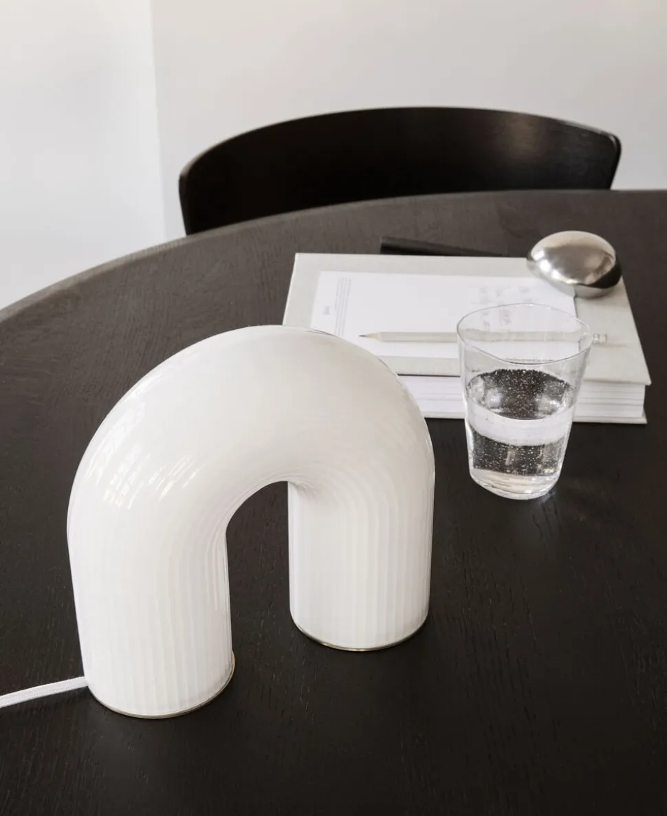 Vuelta-lampen er en prangende lyskilde med en skulpturel bue, der minder om gamle søjler. Den er lavet af opalglas med en rillet overflade, som giver den et tiltrækkende stofligt udtryk. Den er designet med en LED-lyskilde, der udsender et blødt, diffust lys, og den er udstyret med en justerbar lysdæmper til det ultimative stemningslys. Brug den som en dekorativ lampe i et mørkt hjørne eller på en hylde for at lyse bogsamlingen op.