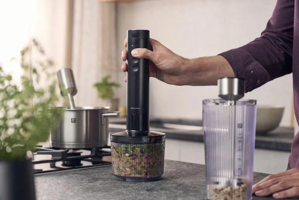 Ingen kabler. Fuld power. Din nye frihed i køkkenet: ZWILLING XTEND Cordless-stavblender. Op til 45 minutters* batteridrift sikrer fleksibel brug uden genopladning undervejs. Og samtidig får du lige så meget power som ved en blender med ledning. Det udtagelige batteri passer til alle apparater i ZWILLING XTEND Cordless-serien. Forlæng blenderens driftstid med ekstra batterier. Batteriet medfølger ikke, men fås som sæt eller enkeltvist 100 % fleksibilitet: Blenderen har tre hastighedstrin, og klarer alt fra smoothie til puré i en håndevending! Den børsteløse BLDC-motor holder ikke kun længere, men sparer også på batteriet takket være sit gennemtænkte design. Takket være det høje effektiniveau hører klumper i smoothien fortiden til. Samtidig opstår der også færre stænk takket være soft-start-funktionen. Inklusive praktisk blenderbæger (600ml) og ekstra lange tilbehørsdele så du også kan bruge blenderen direkte i høje gryder. Kompatibel med alle tilbehørsdele til ZWILLING ENFINIGY stavblenderen for endnu mere alsidighed. ?*Målt med fuldt opladet batteri. Den faktiske driftstid kan variere afhængigt af apparat, opskrift, tilberedningsmængde, anvendt tilbehør og batteriets tilstand. **Strømforsyning medfølger ikke. 30 W strømforsyning anbefales. Mindre effekt giver længere opladningstid.