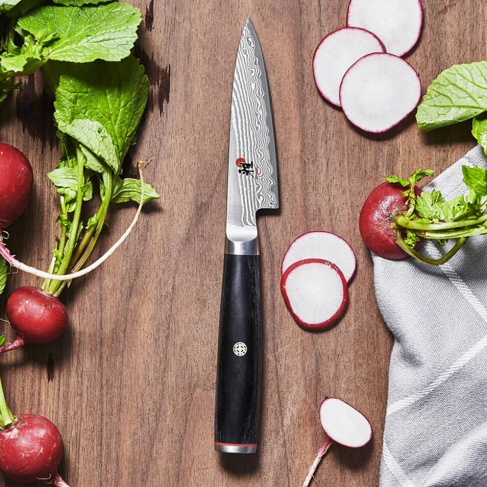 Miyabi 5000 FCD serien er en symbiose af elegant design, den nyeste teknologi og århundredes erfaring med fremstilling af knive. Det smukke knivblad skiller sig ud med sine 48 lag damask stål, og en kerne af FC61 stål, med en hårdhed på 61 Rockwell og en ultra skarp Honbazuke slibning, sikrer at alle skæreopgaver i køkkenet udføres med lethed. Honbazuke slibningen stammer fra traditionel japansk knivfremstilling – hvert knivblad slibes og poleres af 3 omgange, alle med håndkraft. Knivstålets fulde potentiale opnås ved is-hærdning FRIODUR® hærdningsprocessen sikrer ekstrem hårdhed, skarphed, slidstyrke og korrosionsbestandighed. Kvag det høje Rockwelltal vedligeholdes og slibes knivene på en slibesten, en keramisk slibestav eller med Miyabi knivskærperen. Det sorte skaft af Pakka-træ er perfekt afbalanceret og ergonomisk, således arbejdet med kniven forbliver en fornøjelse. Serien består af 9 forskellige knive.