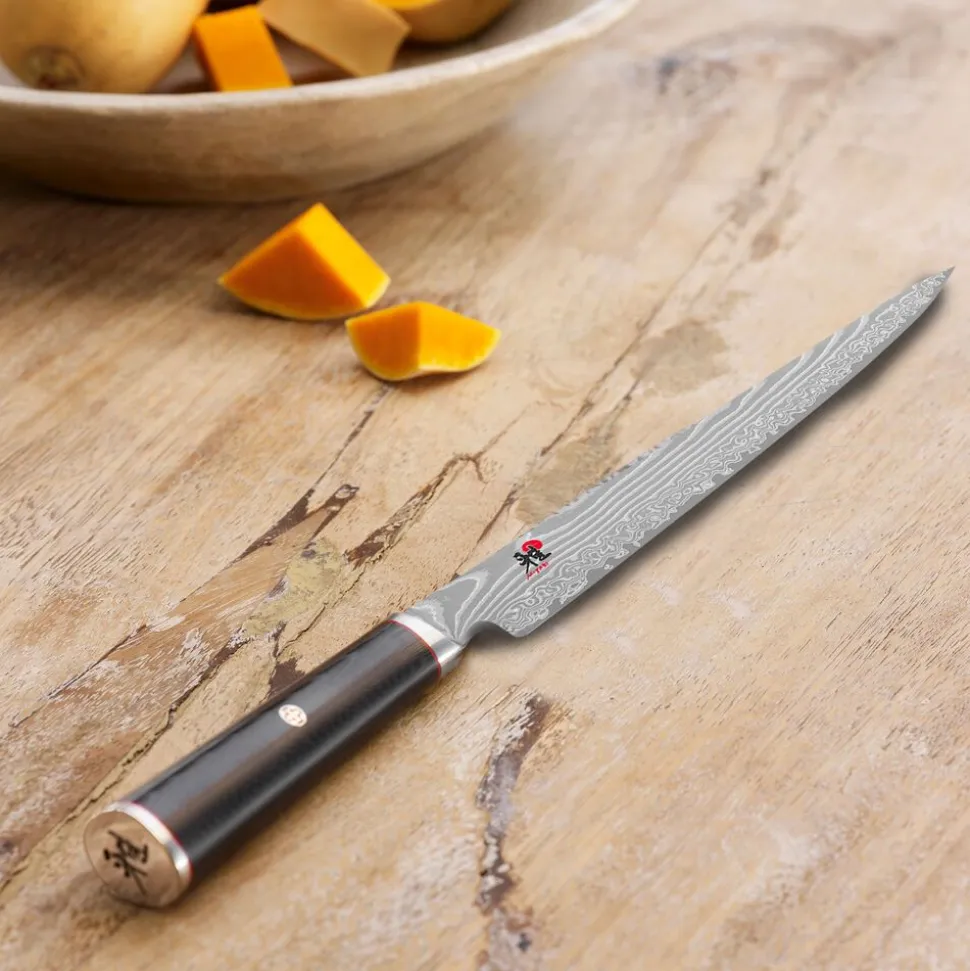 Miyabi 5000 FCD serien er en symbiose af elegant design, den nyeste teknologi og århundredes erfaring med fremstilling af knive. Det smukke knivblad skiller sig ud med sine 48 lag damask stål, og en kerne af FC61 stål, med en hårdhed på 61 Rockwell og en ultra skarp Honbazuke slibning, sikrer at alle skæreopgaver i køkkenet udføres med lethed. Honbazuke slibningen stammer fra traditionel japansk knivfremstilling – hvert knivblad slibes og poleres af 3 omgange, alle med håndkraft. Knivstålets fulde potentiale opnås ved is-hærdning FRIODUR® hærdningsprocessen sikrer ekstrem hårdhed, skarphed, slidstyrke og korrosionsbestandighed. Kvag det høje Rockwelltal vedligeholdes og slibes knivene på en slibesten, en keramisk slibestav eller med Miyabi knivskærperen. Det sorte skaft af Pakka-træ er perfekt afbalanceret og ergonomisk, således arbejdet med kniven forbliver en fornøjelse. Serien består af 9 forskellige knive.