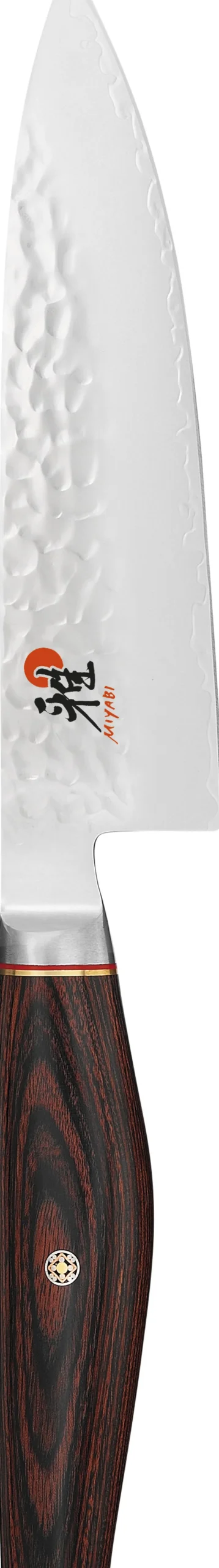 Æstetik og funktion på går hånd i hånd med godt design. Knivene i MIYABI 6000MCT serien ser usammenligneligt godt ud – og deres funktionelle egenskaber imponerer både fagfolk og entusiastiske amatør kokke. En af grundene er at blad og håndtag matcher hinanden perfekt, hvorved der dannes en enkelt harmonisk enhed. Knivbladet er fremstillet i 3 lag stål, med en kerne af Micro Carbide pulver stål MC63. Den specialudviklet is-hærdningsproces CRYODUR® garanterer en ekstrem hårdhed på 63 Rockwell og en varig skarp kniv. Overfladen er banket, en teknik som kaldes Tsuchime, hvilket giver et visuelt imponerende og sofistikeret orientalsk udseende. Honbazuke slibningen, som sikrer en ulltra skarp kniv, stammer fra traditionel japansk knivfremstilling – hvert knivblad slibes og poleres af 3 omgange, alle med håndkraft. Kvag det høje Rockwelltal vedligeholdes og slibes knivene på en slibesten, en keramisk slibestav eller med Miyabi knivskærperen. Skafterne er i det smukt årede, hårdføre pakkatræ og blødt afrundede, så de ligger godt og fast i hånden. Serien består af 8 forskellige knive.