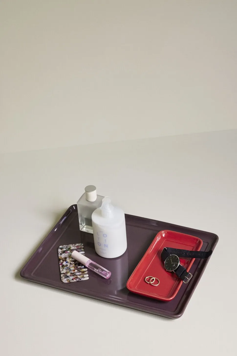 Stor bakke i keramik i farven bordeaux med en mindre rød bakke i keramik.