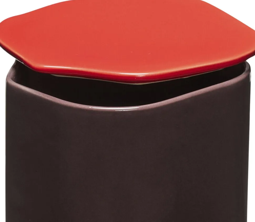 Keramisk opbevaringsbeholder med låg i rød og bordeaux.