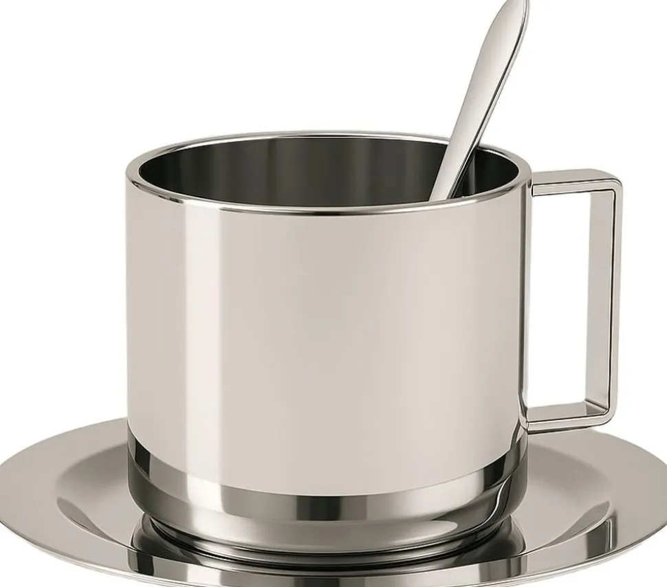 Elegant kaffetrio i poleret stainless steel med kop, underkop og ske. Thermokoppen holder drikken varm, mens det robuste materiale sikrer holdbarhed og nem vask. Et stilfuldt valg for kaffeelskere.