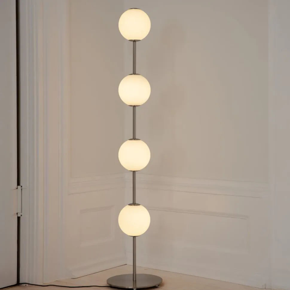 Få en indbydende elegance med Audrey-gulvlampen. Audrey-gulvet er omhyggeligt designet til at bringe et sofistikeret touch til hjemmet og vil løfte dit rum med sine udsøgte detaljer. Med sine metaldetaljer og mundblæste, opale glaskugler udstråler Audrey-gulvet en fængslende varme og elegance, der minder om strålende perler. De fine kugler spreder lyset og skaber en beroligende atmosfære. Audrey-gulvlampen kan dæmpes via en diskret knap på toppen af lampen, så du kan justere lyset for at skabe forskellige stemninger. Med en blød glød vil Audrey-gulvet lyse op i det omkringliggende område og skabe en hyggelig stemning i alt fra din stue til din entré.