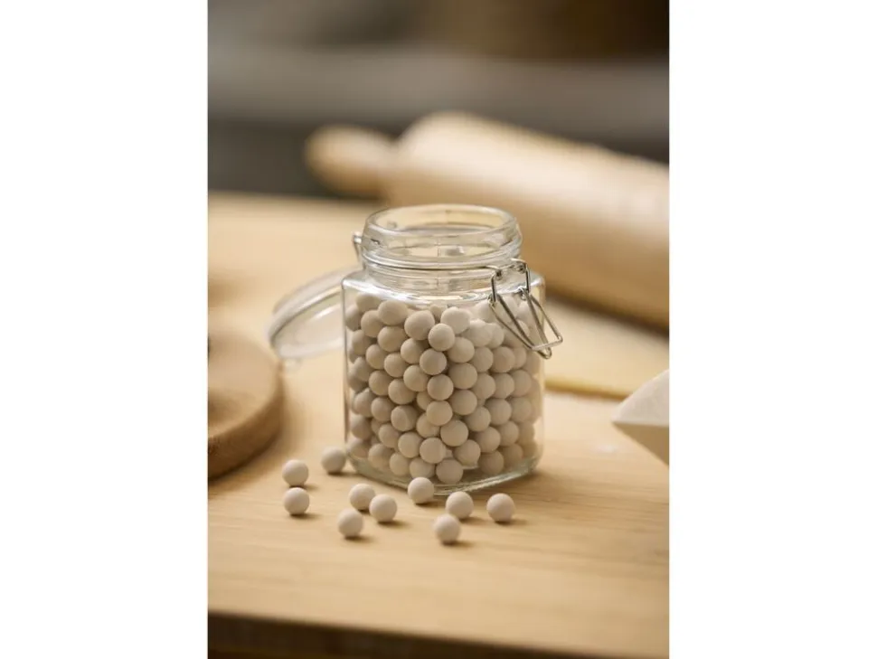 Keramiske bagekugler sørger for, at du altid får en perfekt tærtebund. Læg bagepapir over dejen, så det dækker hele overfladen. Fordel bagekuglerne jævnt, og bag som normalt så slipper du for, at bunden hæver op. Bagekuglerne er varmebestandige og kan bruges igen og igen.