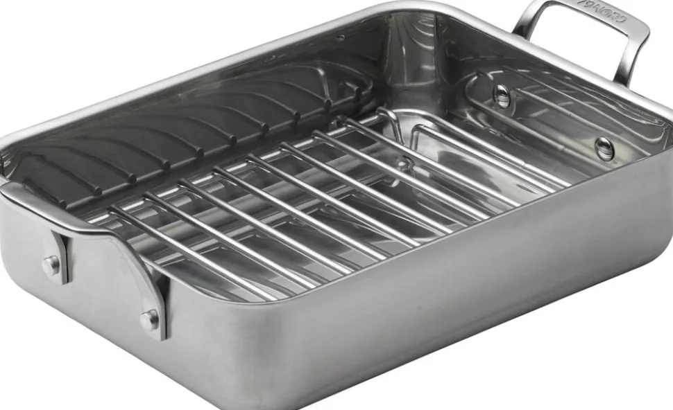 Bradepande af høj kvalitet i rustfrit stål med rist og tyk bund på 1 mm. Bradepanden kan anvendes uden rist til tilberedning af bl.a. kage og grøntsager og med rist til flæskesteg, kylling og meget mere. De opretstående håndtag sikrer, at bradepanden er let at tage fat i og håndtere. Bradepanden måler 40 x 25 x 10 cm inkl. håndtag.