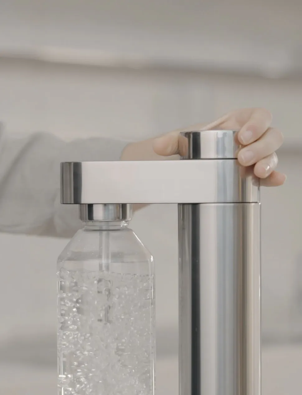 Med Brus kulsyremaskine sparer du miljøet for store mængder af unødigt plast ved at lave din egen danskvand eller sodavand i genanvendelige flasker. Designet af sodavandsmaskinen er så elegant, at du kan glæde dig over at have den stående fremme på køkkenbordet. Designeren bag, Søren Refsgaard er kendt for sit rene funktionelle design, hvor alt overflødigt er skåret væk. Det er Brus et særdeles godt eksempel på. Designet trækker på de cylindriske former, der er klassisk for Steltons design. Den cylindriske form ses først og fremmest i den ultraslanke beholder til kulsyrepatronen og går igen i kulsyreknappen, der intuitivt drejes med uret for at tilpasse mængden af kulsyre og drejes kontra, når flasken skal løsnes fra maskinen. Brus kulsyremaskine leveres med et styk Brus flaske.