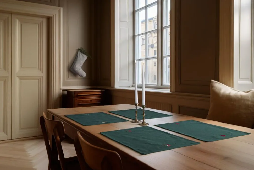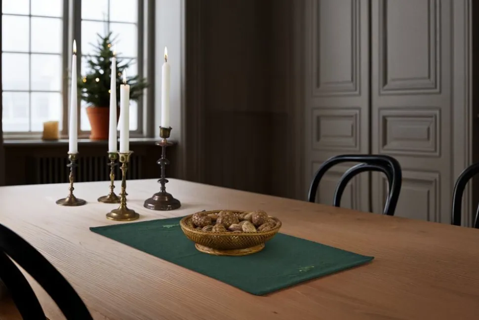 Mærk stemningen med JUNA Christmas Fable magiske juletekstiler til alle rum. Juleeventyr, fantasi og humoristiske dekorationer med masser af cosy kant. Med JUNA Christmas Fable får du en serie af moderne tekstiler med broderede motiver, der både æstetisk og legende forankrer og fornyer julens helt særlige stemning gennem et magisk juleunivers fuld af traditioner, hygge og personlighed. Tænk på en komplet og fuldstændig gennemført julekollektion af certificerede tekstiler til både dit køkken og resten af hjemmet. De dekorative julesokker på trappen fyldt op med dagens kalendergaver. Duftene fra køkkenet, der blander sig med hjertevarme forventninger og kærlige minder om en hyggelig aften i stuen. Den ikoniske juleborddækning, der løfter stemningen og får både børn og voksne til at glædes sammen. Og forestil dig så det hele tilsat nærmest karikerede klassiske broderier, der fortæller endnu flere historier end de tråde, de er syet med. Tryllebunden misteltensmagi, skitseagtige juletræer, nuttede rensdyr, ikoniske julehjerter og fluffy julestjerner. Alle skabt med masser af glimt i øjet i en sød og bevidst naivistisk stil, der ikke kan undgå at sende dit julehumør helt op til den skønneste stjernehimmel. JUNA Christmas Fable er skabt til at samle os omkring bordet, i køkkenet og også trække julestemningen med helt ind på puden, inden vi rammer drømmeland. Fuld af små broderede detaljer. Spækket med de helt store julefølelser. Denne fortryllende JUNA Christmas Fable-dækkeserviet i en dyb julegrøn farve er dekoreret med to broderede motiver af seriens juletræ omgivet af de yndigste små julestjerner, der titter frem på hver side af dækkeservietten, så du ikke skjuler de søde dekorationer, når du dækker op med tallerkener og bestik. Dækkeservietten måler 49×32 cm og kommer i et skønt mix af GRS-certificeret genanvendt bomuld, GRS-certificeret genanvendt polyester og en lille smule viskose, der gør stoffet ekstra lækkert. JUNA Christmas Fable-serien giver dig et bredt udvalg af certificerede juletekstiler til hele hjemmet, hvor du mærker julestemningen i hver eneste tråd, og som du kan glæde dig til at finde frem jul efter jul. En kærlighedserklæring til godt håndværk og dekorativt dansk design vævet sammen af store eventyr og små broderede detaljer skabt til at holde længe og blive elsket endnu længere. (GRS Certified by Control Union, 1026087)