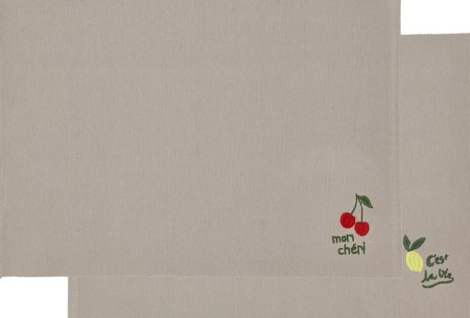 Træd ind i den charmerende stemning fra en fransk café lige i dit eget hjem med vores helt nye Bistro-kollektion til bord og køkken. Bistro er designet til at fremkalde den hyggelige og indbydende atmosfære fra din yndlingsbistro. Dækkeservietterne har skønne broderier inspireret af klassiske café-motiver: kirsebær, citroner, kaffekopper og croissanter. Broderierne er farverige, og den neutrale farve i dækkeservietten skaber den perfekte baggrund, der lader de fine design træde frem. Dækkeservietter og servietter kommer i en pakke med to motiver. Hver serviet er dekoreret med skønne motiver af enten kirsebær, citroner, kaffekopper eller croissanter. Det neutrale stof fremhæver de livlige design og kombinerer holdbarhed med legende elegance.