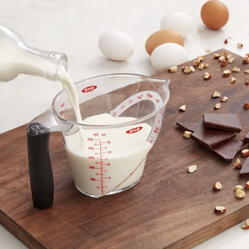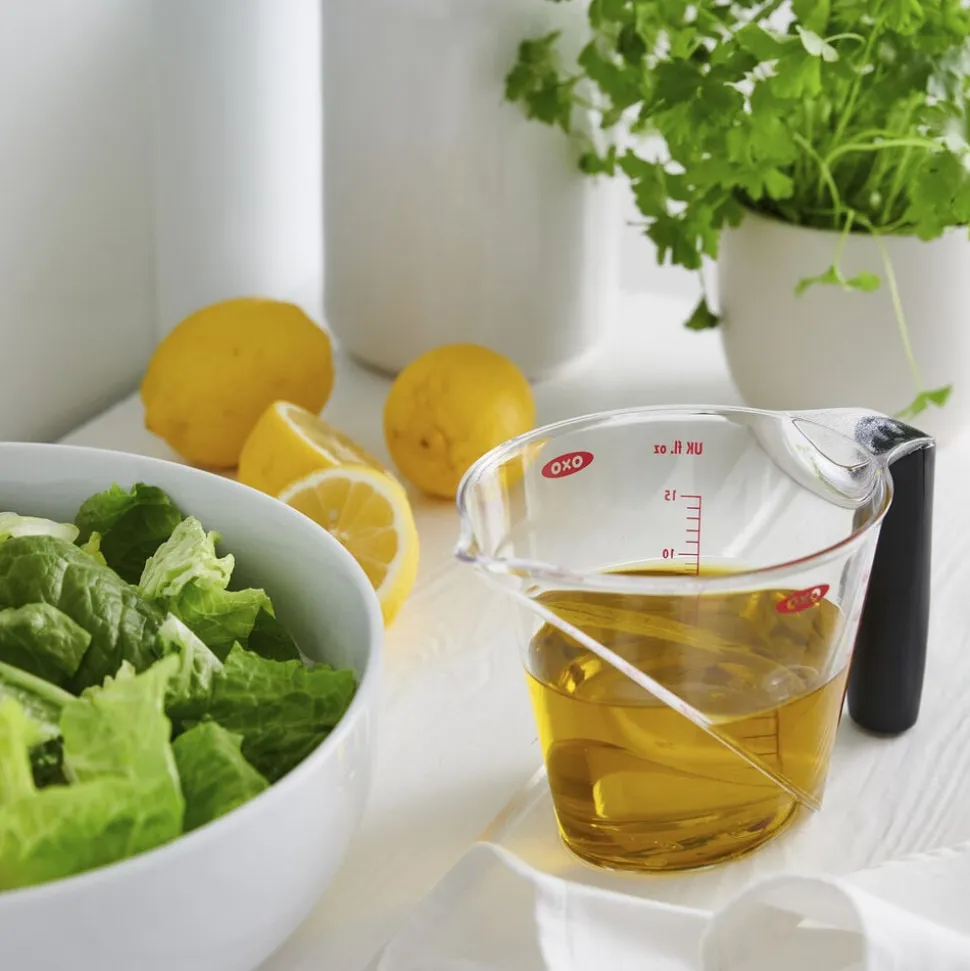 I dette smarte decilitermål fra OXO med mål fra alle sider, kan man med det samme aflæse målene både fra siden og fra oven, som er den vinkel man naturligt kigger fra når man måler ingredienser op. Målene er støbt ind i målebægrene, så de kan tåle maskinopvask. Decilitermålet har et behageligt, ergonomisk non-slip gummihåndtag. Decilitermålet viser målene i både ml og cups