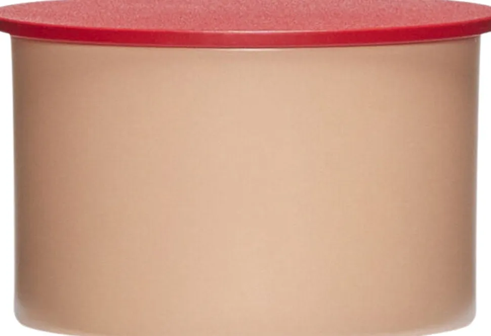Rød og lyserød lille opbevaringsbeholder fremstillet af Pudder metal.