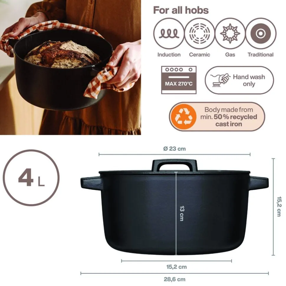 Folken Gryde emaljeret Støbejern. Enestående holdbarhed og 100% fri for plastik. Leder varmen godt. Anbefalet max. stegetemperatur og ovnfast op til 270 °C. Reduceret vægt 28% lettere end ref. Støbejernsgryder. Emaljeret belægning forhindrer støbejern i at ruste og gør det lettere at rengøre. Stegning uden fedtstof er muligt pga. emaljebelægningen. Håndvask anbefales.