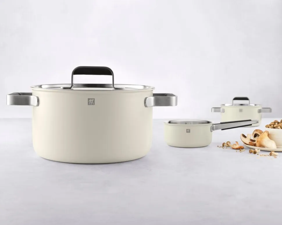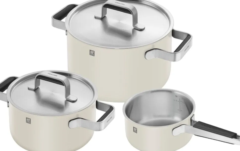 En hyggelig morgen. Fuldstændig rolig og afslappet. Det er, hvad den elfenbenshvide farve står for. Og det er, hvad det elfenbenshvide ZWILLING Pure kogegrej står for. Det første trelags rustfri stål-kogegrej med en keramisk yderbelægning en fusion af rent design og ydeevne. Trelagsbunden leder varmen hurtigt og jævnt. Det højkvalitets rustfri stål sikrer fremragende varmebevarelse. Og den foldede kant gør det muligt at hælde uden at spilde. Med de tre gryder kan du skabe kulinariske lækkerier igen og igen.