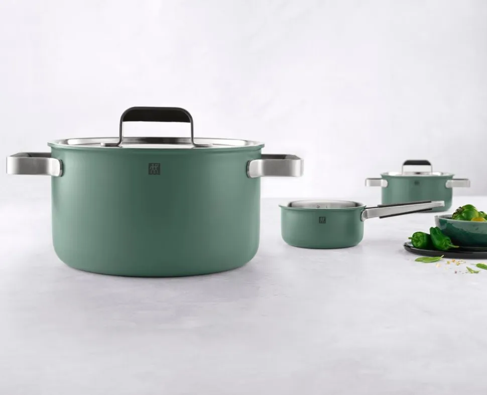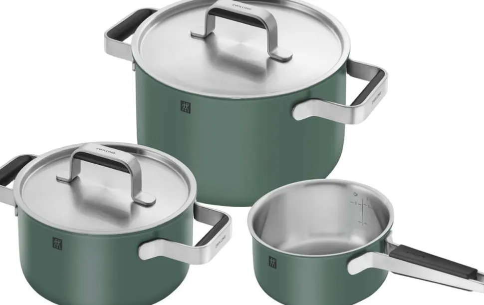 Naturlig, frisk og nem at nyde. Det er, hvad farven grøn står for. Og det er, hvad vores ZWILLING Pure kogegrejssæt i grøn står for. Det første trelags rustfri stål-kogegrej med en keramisk yderbelægning tilbyder dig design og ydeevne i sin reneste form. Højkvalitets rustfrit stål sikrer optimal varmebevarelse. Robust, holdbart og hygiejnisk. Dertil kommer en trelags bund, der giver hurtig og jævn varmefordeling. Den foldede kant gør det muligt at hælde uden dryp.