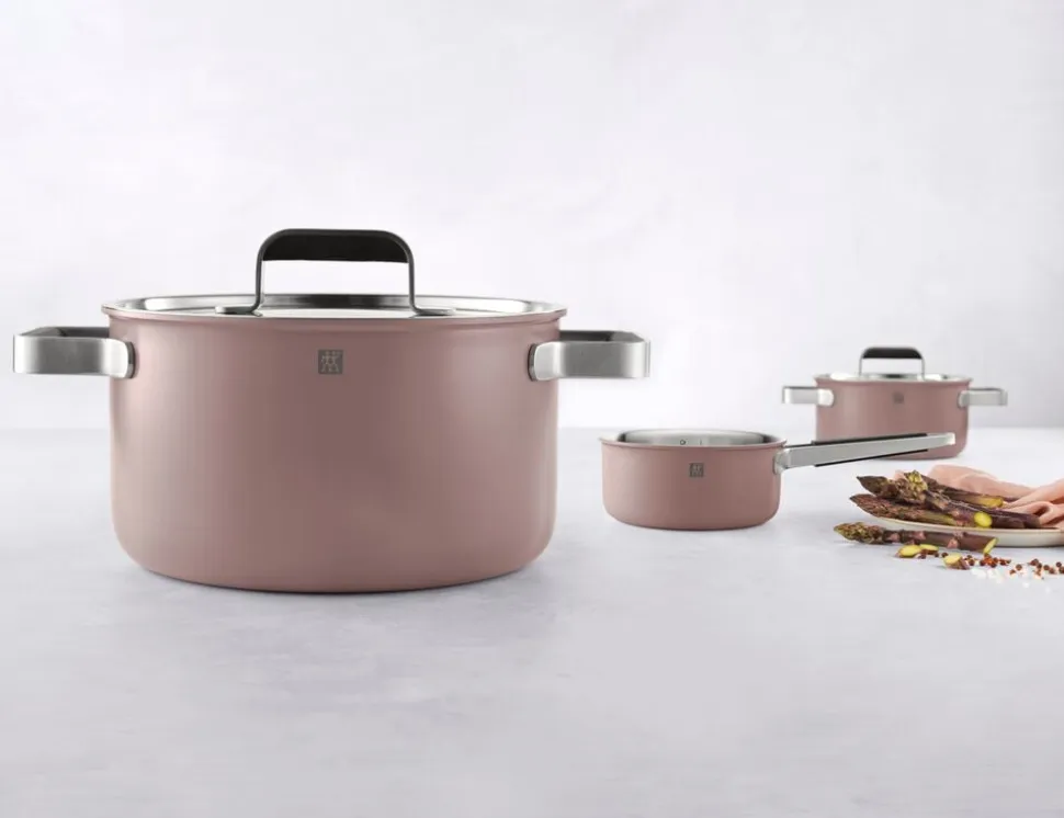Slap af og nyd med en portion af din yndlingsmad. Tilberedt med ZWILLING Pure kogegrej i delikat rosé. Det første trelags rustfri stål-kogegrej med en keramisk yderbelægning en kombination af design og ydeevne. Fremstillet af højkvalitets rustfrit stål: robust og holdbart, med optimal varmebevarelse. Jævn varmefordeling takket være trelags bundteknologi. Nem hældning uden dryp takket være den foldede kant. Så du kan tilberede din komfortmad med lethed.