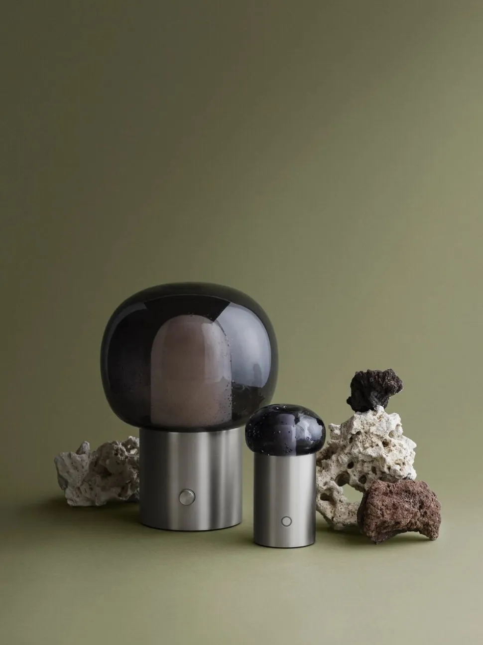 Med udgangspunkt i Sebastian Herkners helt særlige Design, findes der nu en indendørs bordlampe, der viderefører de usædvanlige Design elementersom den store glasskærm med lukkede luftbobler. Design er tilpasset fra det lille Outdoor armatur, men er vokset i størrelse mange gange. Det store armaturhoved giver et endnu bedre udsyn til luftboblerne, der minder om en undersøisk verden. Lyselementet skinner indefra og fremtryller magien ved det dybe hav i dit hjem. I modsætning til den lille version stikker tænd/sluk-kontakten ud og har en riflet drejeknap. De riflede diamanter giver dette et taktilt touch og bryder det rene Design af aluminiumsbasen. Lysenes funktioner er de samme, så du kan dæmpe de tre lysfarver, når du vil.