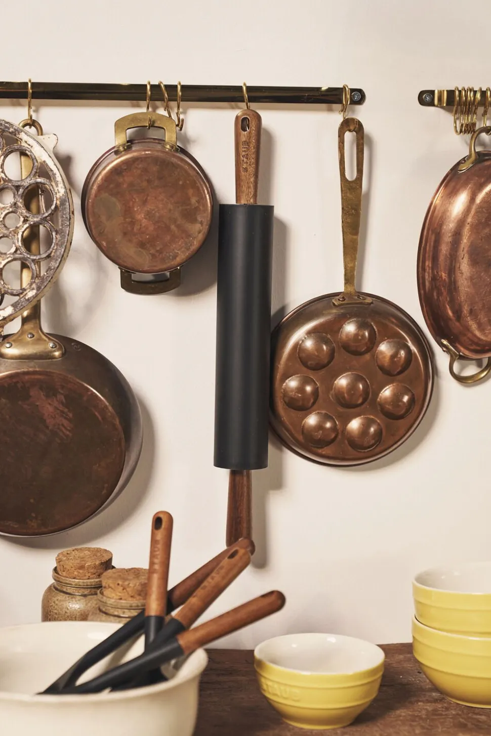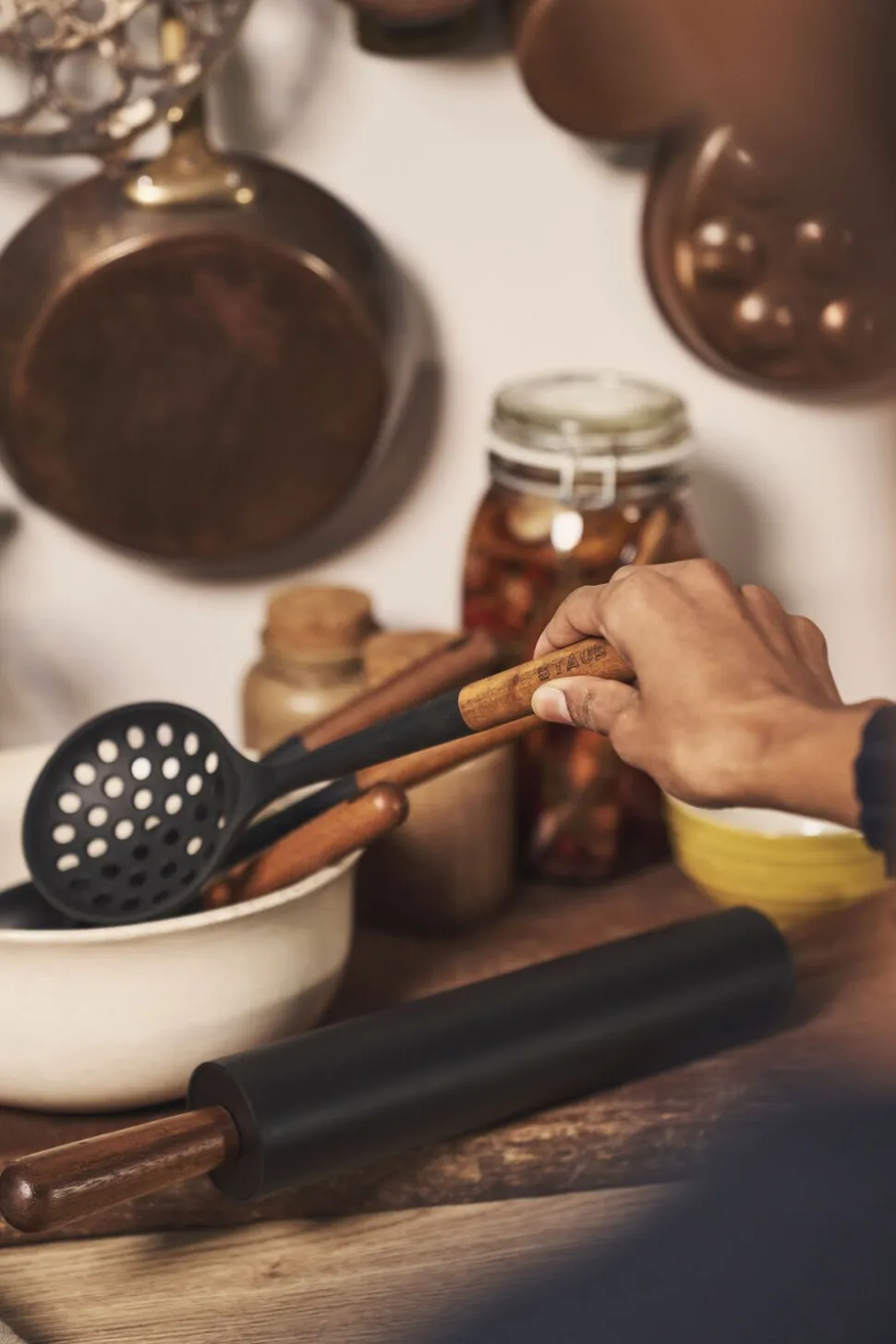 Køkkenredskaberne fra Staub Tools er både funktionelle og smukke, og designet til ergonomisk at ligge perfekt i hånden. Multiskeen har et langt håndtag i miljøvenligt Akacietræ og hoveddelen er lavet i BPA-fri mat, sort silikone som er egnet alle køkkengrejs overflader, inklusiv non-stick belægninger. Silikonen er ikke kun ekstremt holdbar, men også varmebestandigt i op til 220°C. kagerullen er nem at rengøre, men bør vaskes op i hånden.