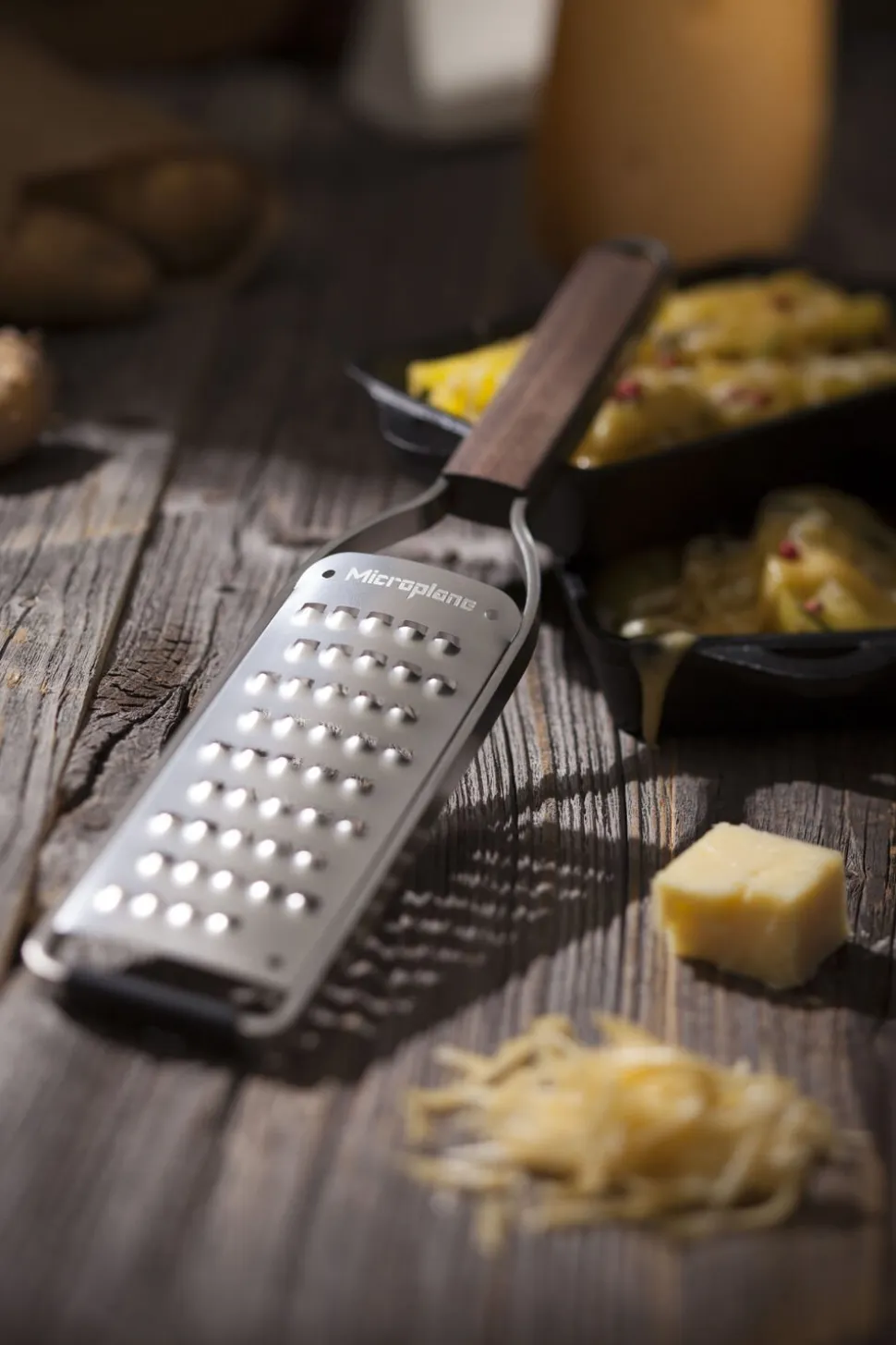 Microplane Master serien byder på rivejern i luksusklassen med knivskarpe ætsede skær, ramme i kraftigt rustfrit stål og greb af amerikansk valnød. Master serien fås i flere varianter fra fin til ekstra grov. Ekstra grov er særlig velegnet til bl.a. grøntsager, rodfruger, smør og marcipan. Tåler ikke opvaskemaskine.