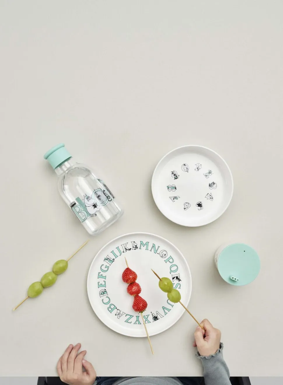 At kunne udtrykke sig er en af de vigtigste ting i verden: det giver mulighed for at kommunikere håb og drømme, forholde sig til andre, engagere sig i vor tids store spørgsmål og skabe forandringer. Alfabetet, der er designet til Moomin ABC kollektionen, er alle baseret på Tove Janssons originale bogstaver. Med den søde Moomin ABC drikkeflaske får barnet nok væske i løbet af dagen. Med en volumen på 0,5 l, har flasken en god størrelse til skole eller udflugter med børnehaven, fylder ikke for meget i tasken og bliver ikke for tung at bære på. Flasken har et skruelåg, som er nemt at skrue af og på for alle i familien, og sikrer at flasken er helt tæt. På flasken er afbilledet Moomin ABC bogstaver samt velkendte og sjove figurer fra Mumiernes verden. Grafikken inspirerer til leg med ord og kan hjælpe med at vække barnets interesse for bogstaver. Selve flasken er lavet af Tritan, et særdeles børnevenligt og holdbart plastmateriale, som ikke går i stykker, hvis flasken bliver tabt på gulvet, og fås med låg og grafik i farverne salmon eller turquoise.